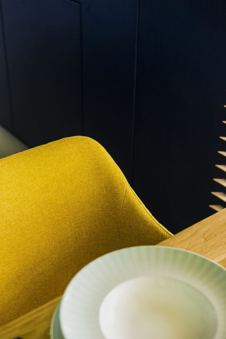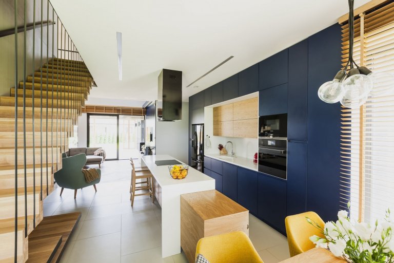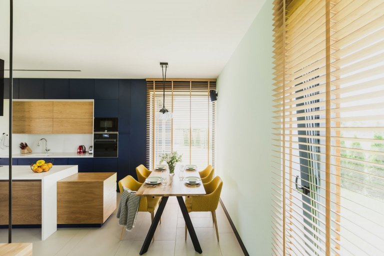 Kuchyňský kout protíná a odděluje dvě funkce – pro stolování i volný čas. Použití kuchyňského ostrova dovoluje pracovat v kuchyni a zároveň umožňuje výhled do okolí. V domě je také místo ke cvičení, které je vášní majitelů. Umístění posilovny v přízemí umožňuje umístění těžkého vybavení na podlahu.