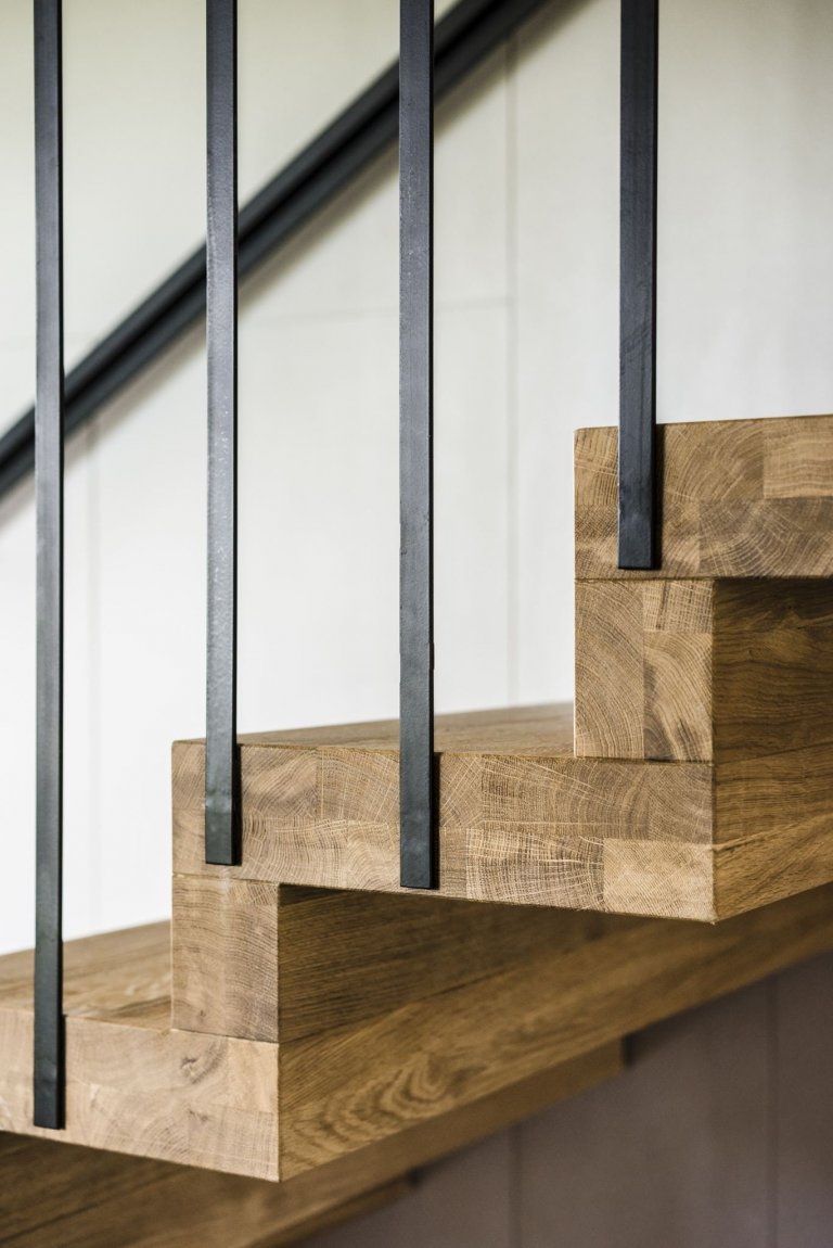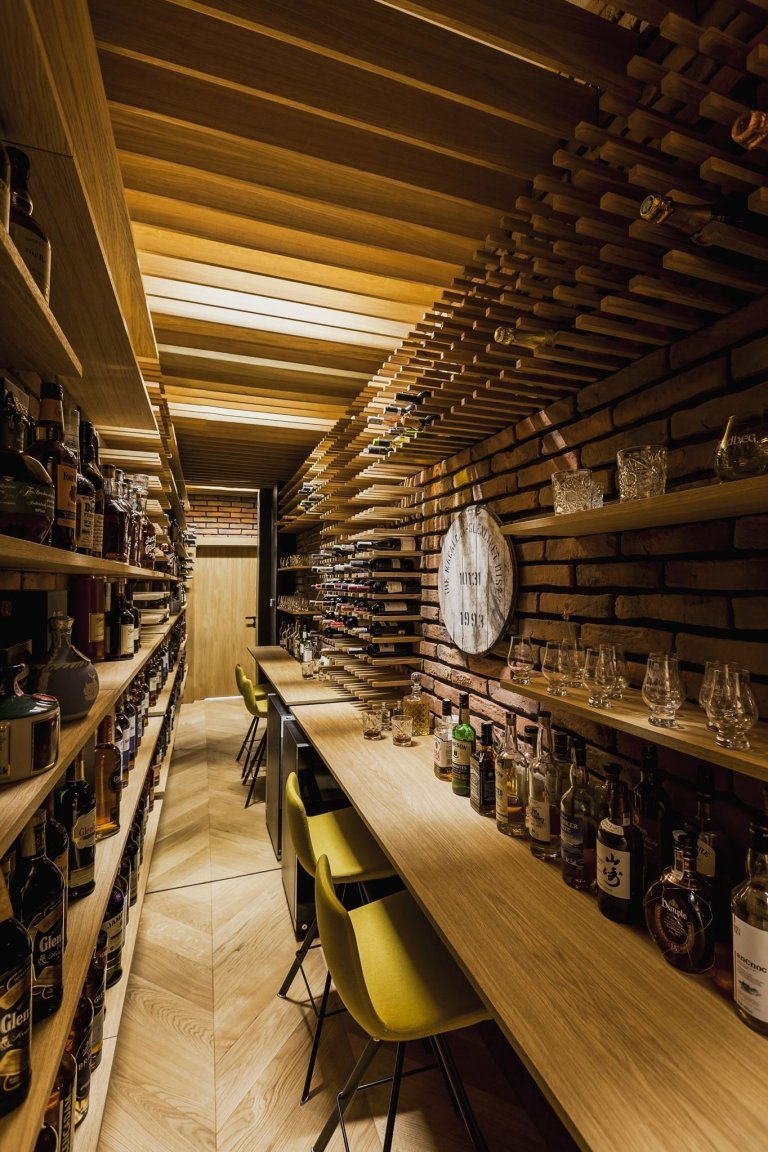 Jedním z mnoha zajímavých řešení uvnitř domu jsou kobercové schody s osvětleným madlem a černými pruty sloužícími jako zábradlí. Dalším zajímavým detailem je velká knihovna v obývacím pokoji. Architekti také naplánovali neobvyklý vinný sklípek. Konstrukce pro skladování lahví se skládá z dřevěných kolíků umístěných mezi řadami cihel na stěně místnosti. V tmavé místnosti můžete cítit chuť vybraného nápoje a současně obdivovat všechny dostupné sbírky vizuálně vynásobené zrcadlem na konci místnosti.