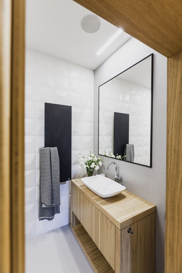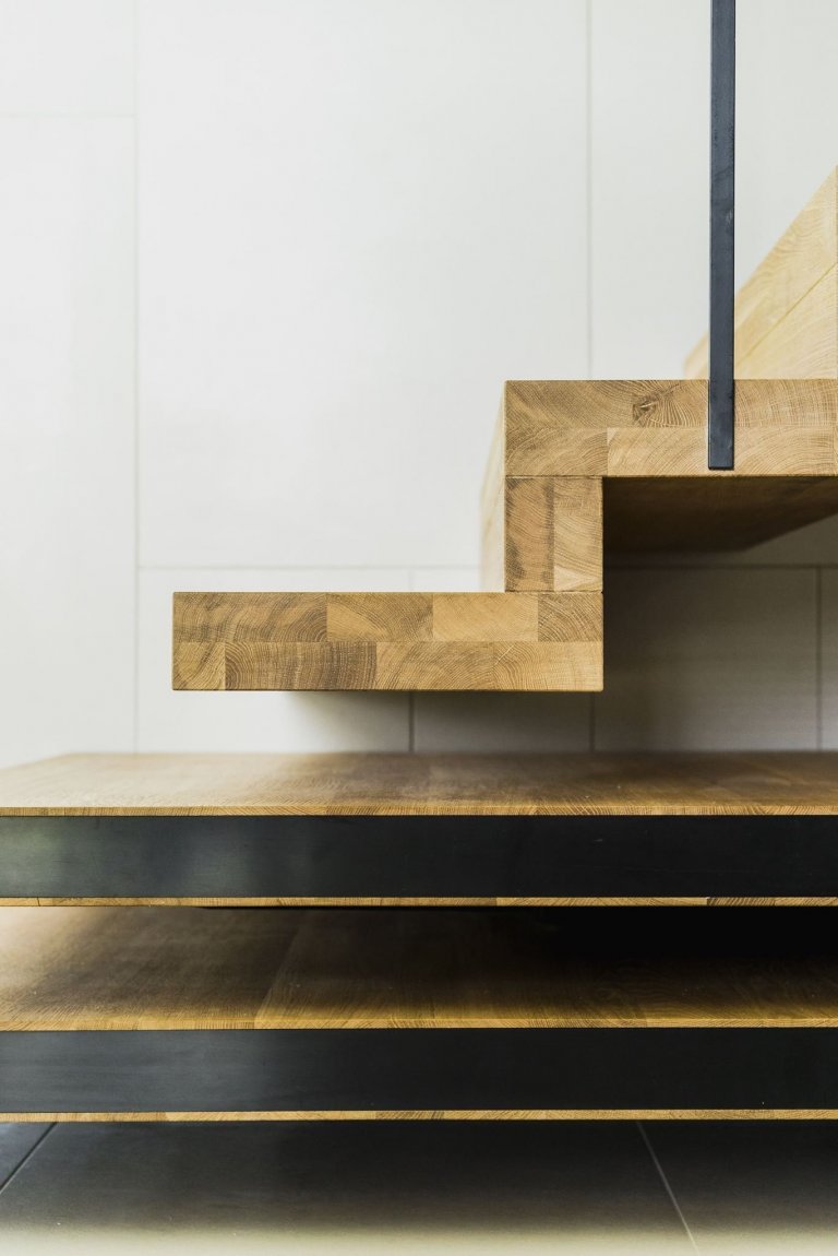 Úkolem domu není jen funkce pro bydlení, ale také pro práci a odpočinek. V interiéru bylo použito stejných materiálů jako venku, což dohromady tvoří harmonický celek. Podlahové parkety a dveře jsou v barvách světlého dřeva. Truhlářské výrobky, radiátory, kliky a sloupky jsou navrženy v černé barvě. Zavedení šedých dlaždic různého rozložení zdůraznilo rozdělení pokojů. Kontrastní barvy byly přidány v měkkých doplňcích, jako jsou pohovka nebo polštářky. Kromě toho byly navrženy odstíny granátového jablka pro jednotlivé kusy nábytku.