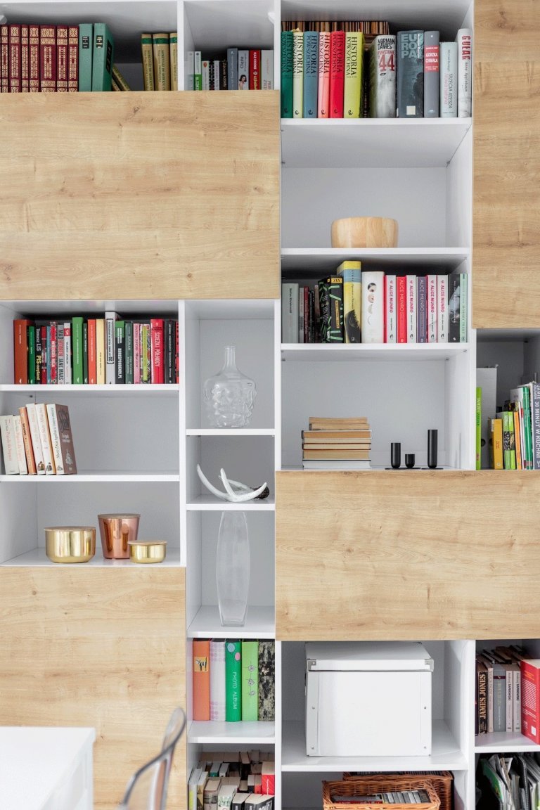 Byt není velký a bylo nutné do něj vměstnat veškeré potřebné náležitosti. Nejmenším pokojem je ložnice majitelů, do které se i přes nevelký prostor, podařilo dostat vestavěné úložné skříně. Jeden z hlavních požadavků majitelů bylo vytvořit v bytě co nejvíc místa k ukládání věcí. To se designéři snažili respektovat a v každé místnosti vytvořili množství skříní, skříněk, nebo úložných polic. Majitelé jsou navíc vášniví čtenáři, v bytě je proto hned několik menších knihoven.