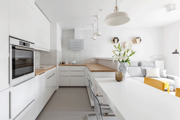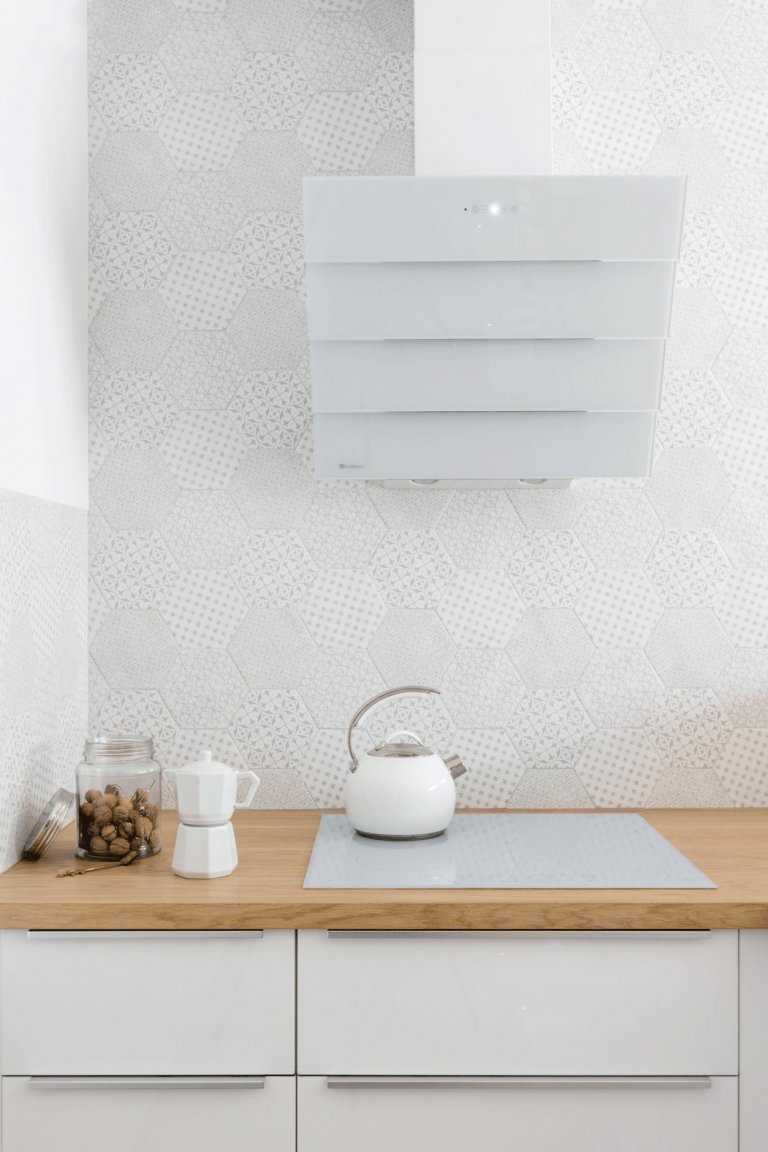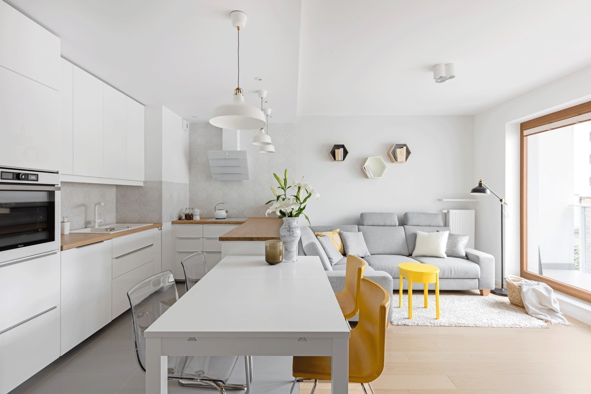 Výběr šestihranných dlaždic do kuchyně nebyl náhodný. Jejich jemné barvy a hravá forma dokonale doplňují jednoduchý bílý nábytek a spotřebiče. Za povšimnutí stojí i volba baterie, dřezu, nebo nenápadných doplňků, které jsou nádherně sladěny. Příjemným kontrastem a oživením je masivní pracovní deska kuchyňské linky, podlaha a zářivě žluté prvky v obývacím pokoji. Aneb jak udělá malý barevný kousek spoustu parády.