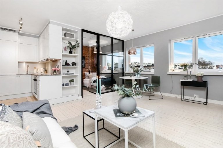 V bytovém designu všech skandinávských zemích zpravidla dominuje jednoduchý nábytek, světlé vybavení, přírodní materiály a spousta světla. Typickým příkladem využití všech těchto aspektů v praxi je malý švédský byt o velikosti 40m2.