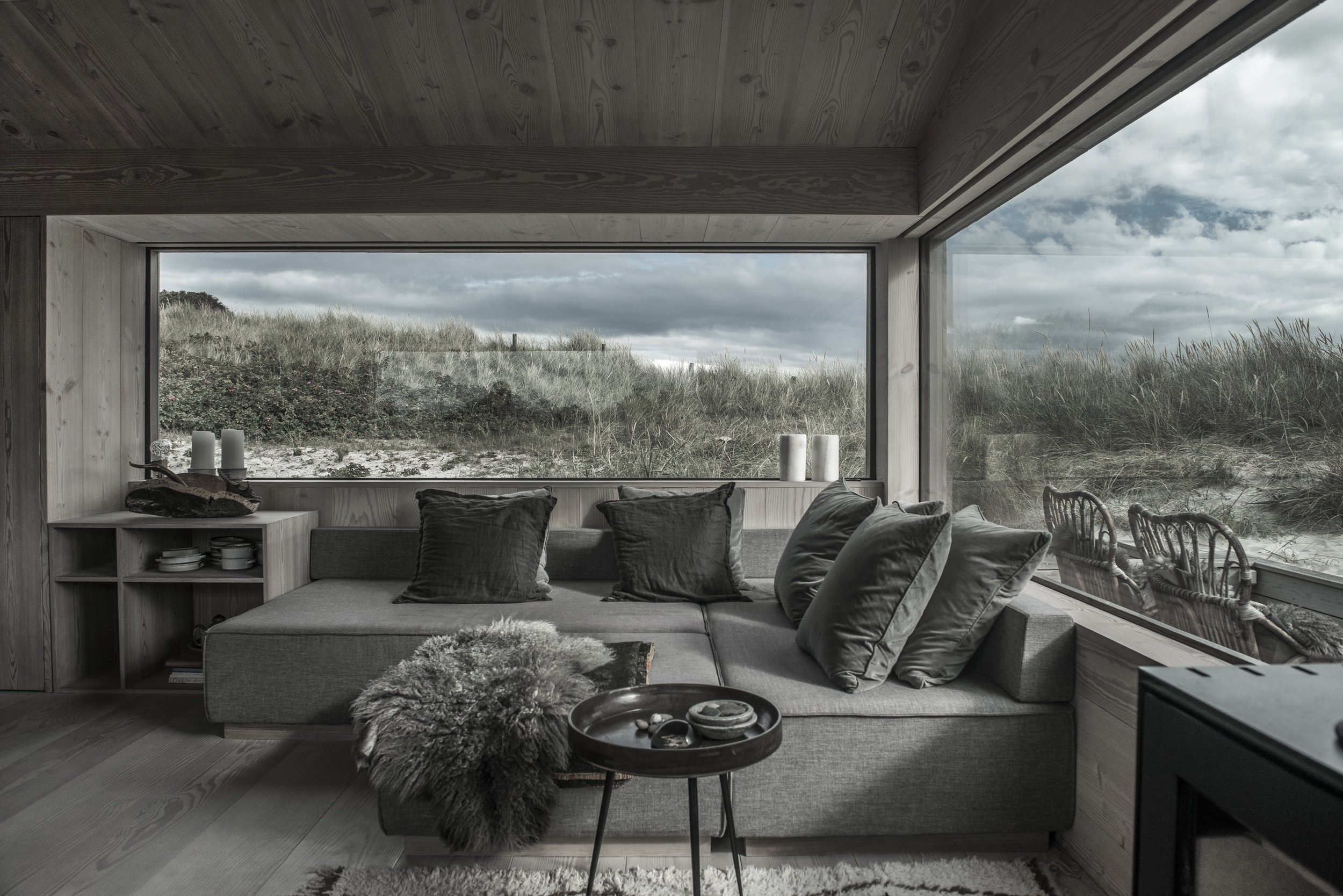Na podlaze je použito také masivní dřevo, v koupelně zase litý beton a koberečky z přírodního lnu a bavlny. Jelikož je bydlení určeno pouze pro víkendové pobyty, není zde potřeba příliš úložného prostoru.Moře je odtud jen kousíček a obyvatelé si tak mohou zajít kdykoliv na příjemnou procházku po pláži.