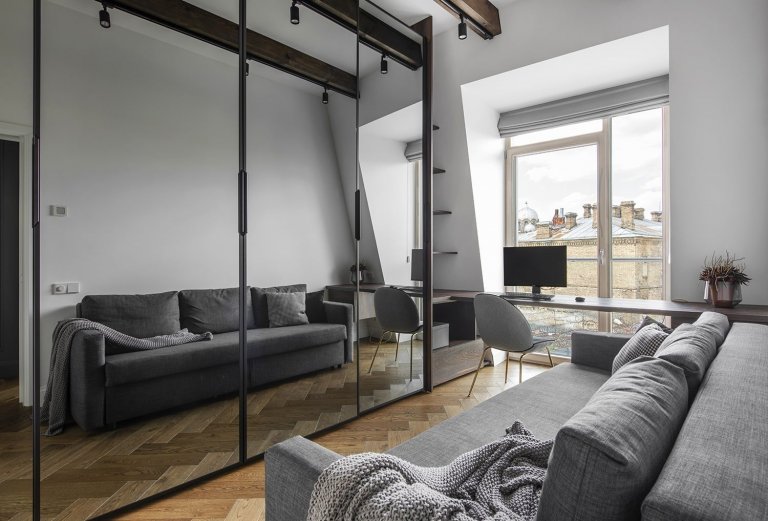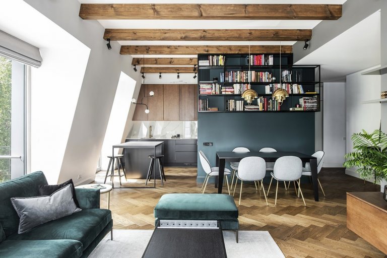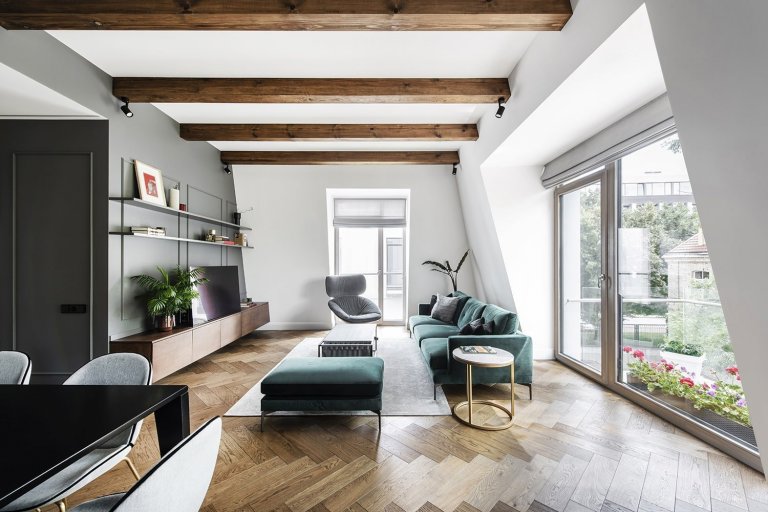 Klasický a moderní styl spojený v bytě z dílny designového studia InArch vypadá velmi přitažlivě. Moderní tvary, mosazné akcenty a odvážné barevné detaily – to všechno dalo vyrůst pozoruhodnému interiéru v hlavním městě Litvy. Své nepopiratelné kouzlo má i zajímavá střešní geometrie, díky které mohou plně vyniknout překrásné dřevěné trámy.