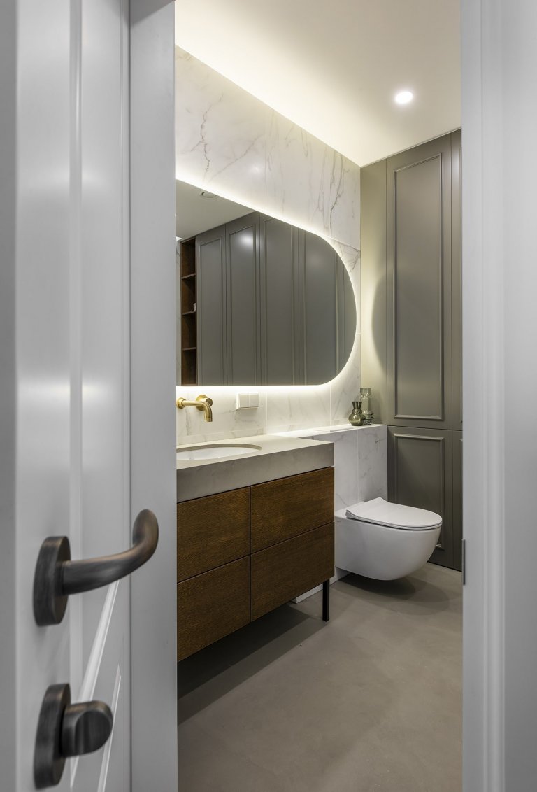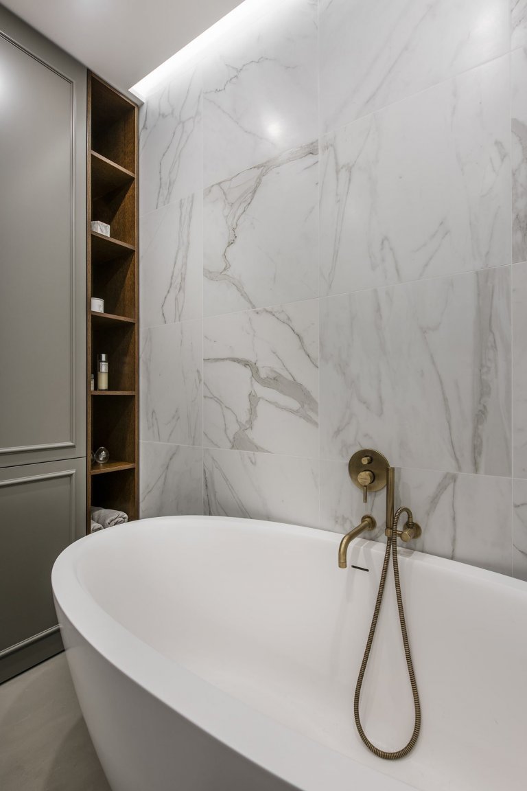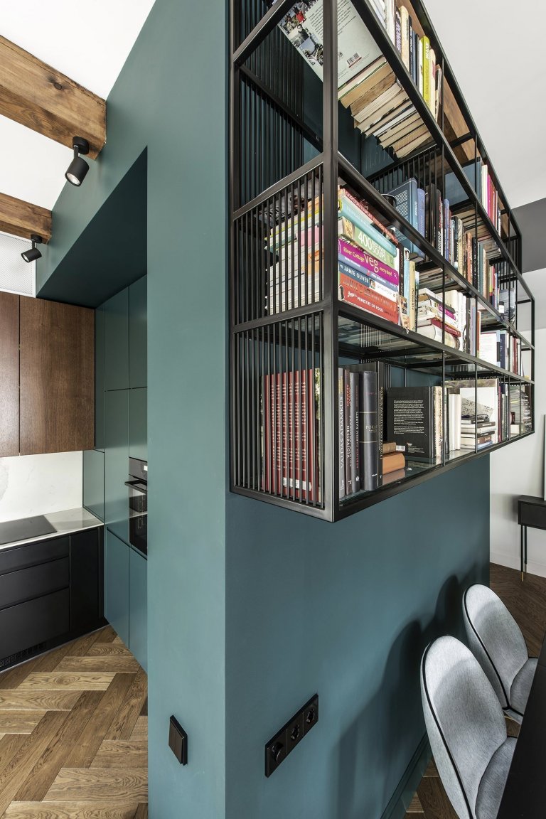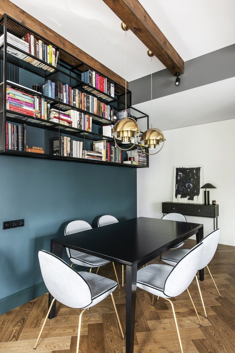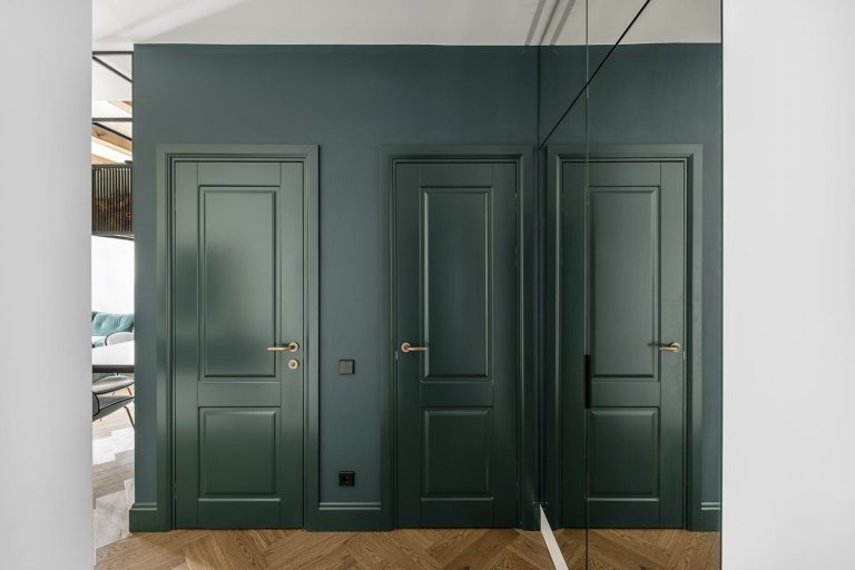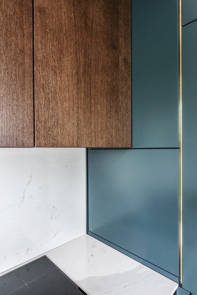 V tomto bytě nevytváří kontrast jen kombinace tradičního a moderního stylu, ale také různorodá paleta barev. Bílé barvě se tu dostalo společnosti tmavě šedé a modrozelené, čímž vznikla opravdu dynamická atmosféra. Celek navíc prozářily a oživily i velké lesklé závěsné lampy a pokojové květiny. Světlý a vzdušný interiér vznikl i díky velkým proskleným plochám s úchvatným výhledem do okolí.
