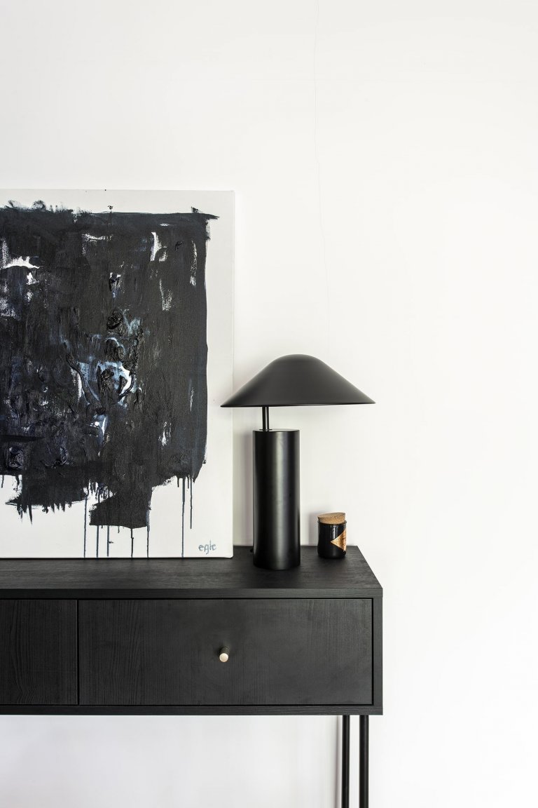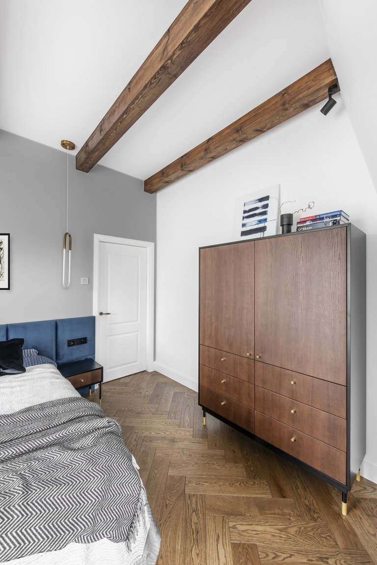 Dřevěné trámy udávají rustikální ráz celému interiéru. Příhodně korespondují se dřevěnými podlahami i bytovými doplňky. Převážně tmavou texturu dřeva pak zesvětlují jemné barvy a vzory umně využité v jednotlivých místnostech. To, co dělá tento litevský byt tak přitažlivým, však tkví zejména v kombinaci tradičního vybavení ruku v ruce s tím moderním. Starobylý ráz zde tak pomalu přechází do současných trendů. Zajímavý je přitom vznikající kontrast. Ten je možné spatřit například na moderně koncipované knihovně zasazené právě pod dřevěné stropní trámy či v případě různých komod a skříněk umístěných poblíž moderních stolů a židlí. A chybět tu nemohou ani odvážně řešená svítidla či obrazy s moderním uměním.