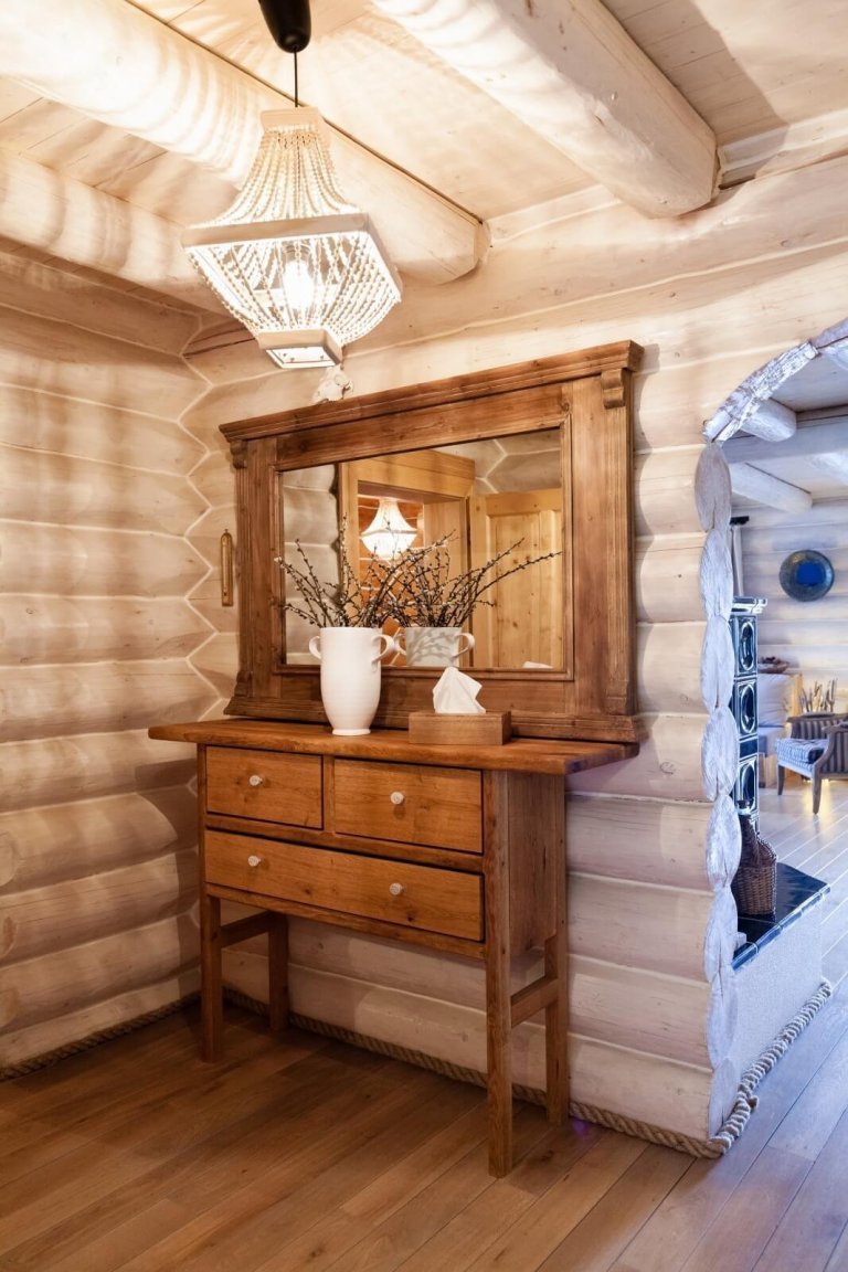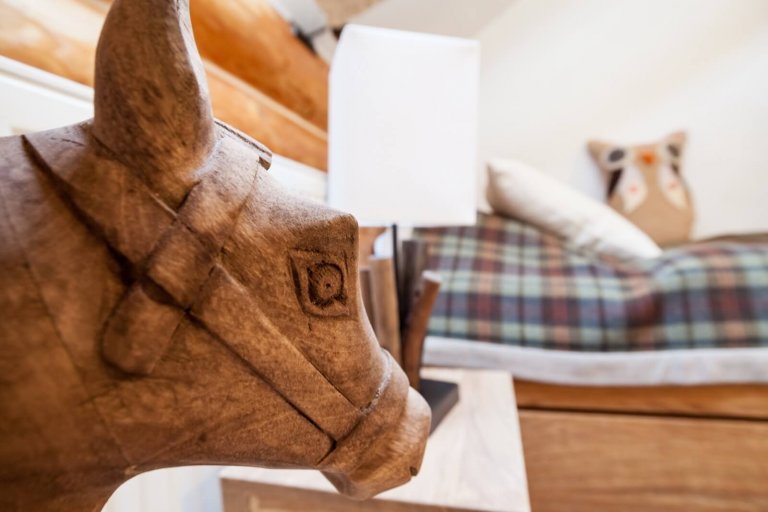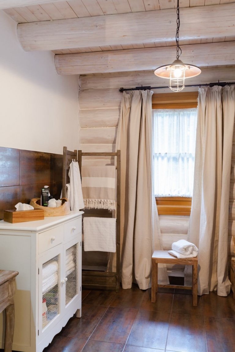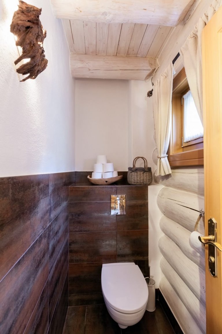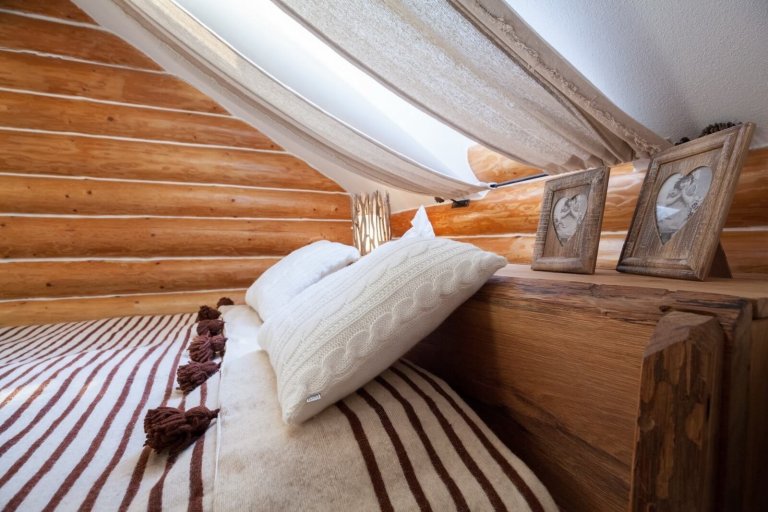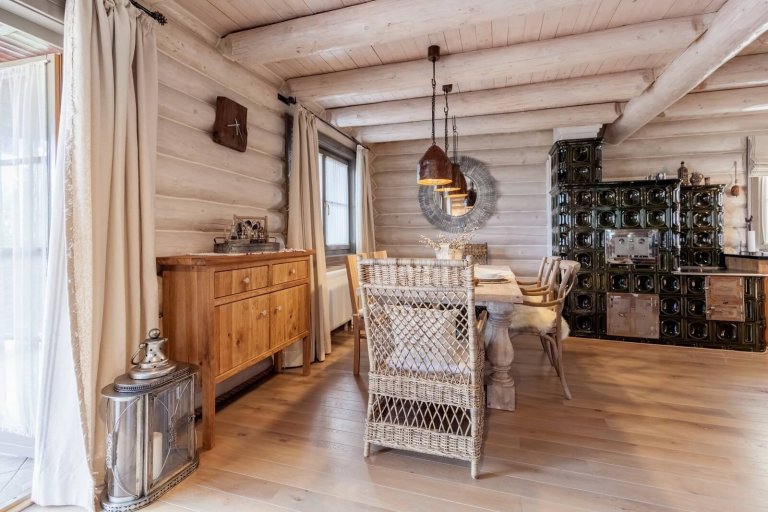 Ačkoliv je celý drub ze dřeva, je takový i nábytek, který sem díky tomu skvěle zapadá. Najdeme zde dřevo v mnoha barvách i podobách - stolky, židle, část sedačky i rámy u zrcadel. Jedinečnost interiéru zajišťují důmyslné dekorace, jako je například stropní osvětlení, které visí nad jídelním stolem, zajímavě zdobená zrcadla a textilie, kterých je v celém srubu požehnaně. Najdeme zde spousty polštářů, přehozů, dek a dalších věcí. Ale jak je všeobecně znémo - textilie dotváří kouzlo domova a k provensálskému stylu neodmyslitelně patří. Povšimnout si musíte i velkých kachlových kamen zelené barvy, které upoutají pozornost na první pohled, navíc díky teplu si je zamilujete. Mě samotnou velmi zaujala koupelna s modrými obklady a vanou na nožičkách, která je romanticky vypadající sama o sobě. A když se k ní postaví i podobné umyvadlo, nedá se nic zkazit. Ačkoliv jde o srub, interiér je opravdu velký, tudíž vhodný k běžnému bydlení. V ložnici si povšimněte nočních stolků, které jsou obloženy klacíky. Dřevo je zde všude, kam se podíváte. A vypadá to opravdu dobře!