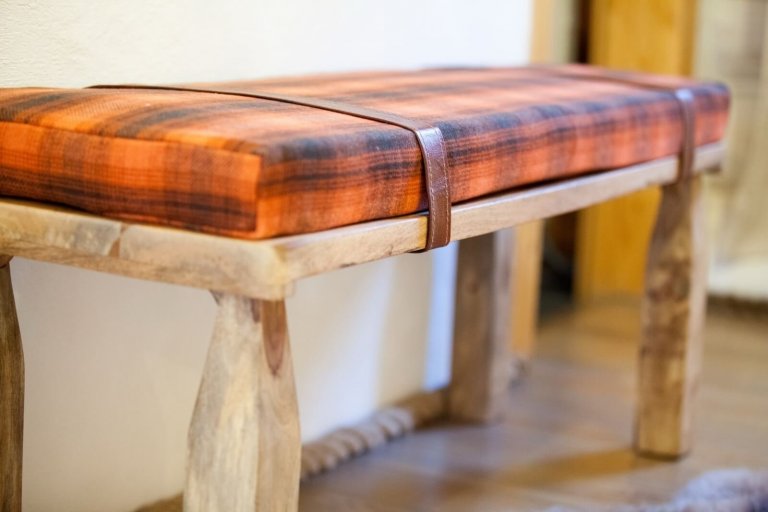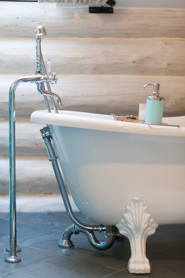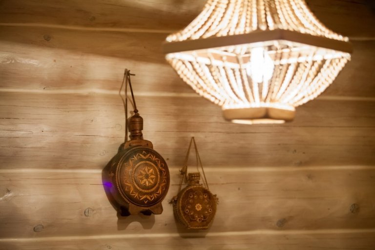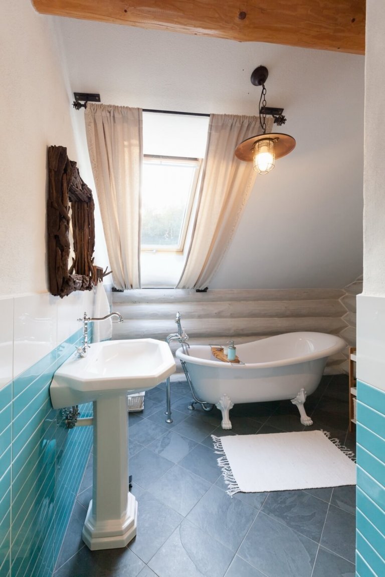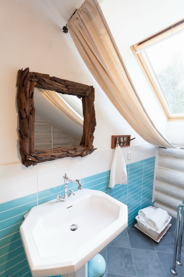 Ačkoliv je celý drub ze dřeva, je takový i nábytek, který sem díky tomu skvěle zapadá. Najdeme zde dřevo v mnoha barvách i podobách - stolky, židle, část sedačky i rámy u zrcadel. Jedinečnost interiéru zajišťují důmyslné dekorace, jako je například stropní osvětlení, které visí nad jídelním stolem, zajímavě zdobená zrcadla a textilie, kterých je v celém srubu požehnaně. Najdeme zde spousty polštářů, přehozů, dek a dalších věcí. Ale jak je všeobecně znémo - textilie dotváří kouzlo domova a k provensálskému stylu neodmyslitelně patří. Povšimnout si musíte i velkých kachlových kamen zelené barvy, které upoutají pozornost na první pohled, navíc díky teplu si je zamilujete. Mě samotnou velmi zaujala koupelna s modrými obklady a vanou na nožičkách, která je romanticky vypadající sama o sobě. A když se k ní postaví i podobné umyvadlo, nedá se nic zkazit. Ačkoliv jde o srub, interiér je opravdu velký, tudíž vhodný k běžnému bydlení. V ložnici si povšimněte nočních stolků, které jsou obloženy klacíky. Dřevo je zde všude, kam se podíváte. A vypadá to opravdu dobře!