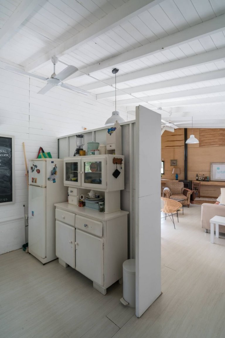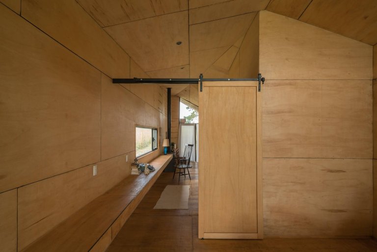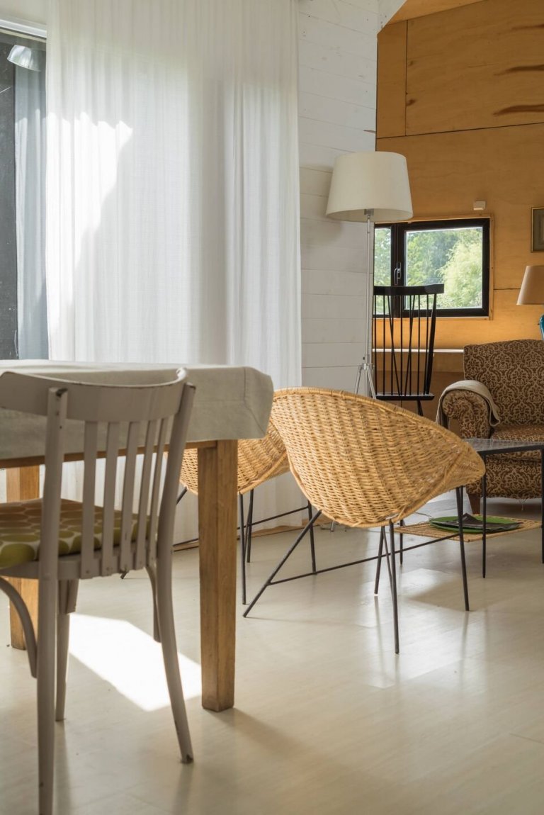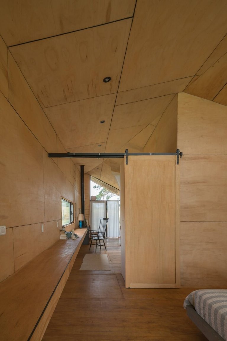 Základem moderní transformace se stala deset let stará chata, která po svém rozšíření získala černou plechovou fasádu a kontrastní interiér, ve kterém vládne dřevo a čistě bílé povrchy. Prázdninový dům sestává ze společenské zóny, domácí pracovny, ložnice, koupelny a kryté terasy. Společné prostory přecházejí do nového prostoru, ve kterém je kancelář spolu s ložnicemi obložena přírodním dřevem. Rozšíření podél jižní osy vede ke kryté terase s výhledem na okolní krajinu. Ve zrekonstruované a rozšířené chatě je i nadále patrný její dávný odkaz. Interiér je světlý a útulný. Díky velkým oknům dovnitř prostupuje dostatek přirozeného světla.