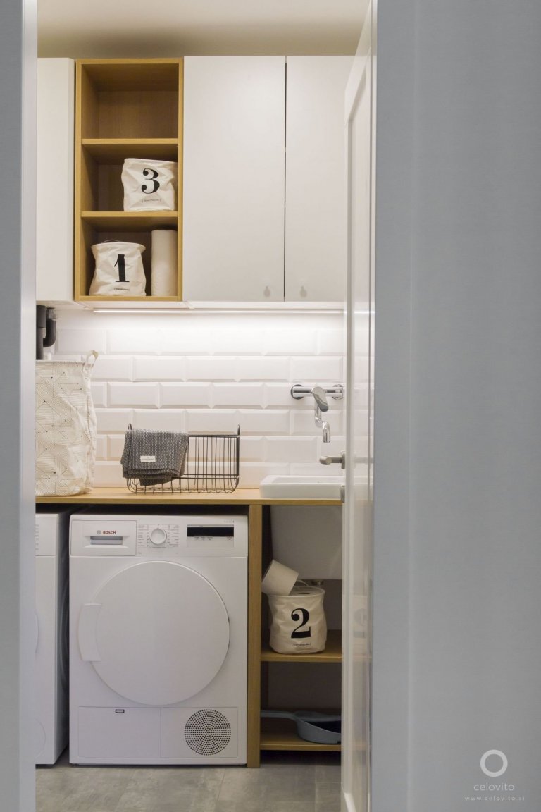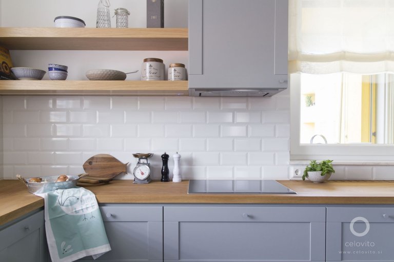 V kuchyni, koupelně, toaletě a spíži stěny zdobí klasické, ale elegantní dlaždice. V koupelně se zrušila rohová vana, která zbytečně zabírala místo a koupelna tak vypadala stísněně, a nahradil ji moderní sprchový kout, dostatečně prostorný, dostatečně dlouhý a otevřený na straně, do které se vstupuje. Byl vytvořen byt s pocitem útulnosti a tradičně navrženou kuchyní s velkým keramickým dřezem. Ačkoli vzhled kuchyně je velmi klasický, má vše, co moderní kuchyně potřebuje. Čela kuchyně byly natřeny šedo-modrou, která je tradiční i moderní. Navíc je z velké části prostor dán podlahami. Vybrány byly parkety z kartáčovaného a naolejovaného dubu, který díky svému zpracování a viditelné struktuře působí rustikálně a teplá barva dává útulný tón celému bytu.