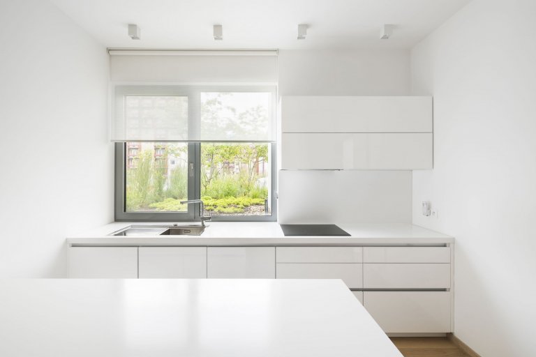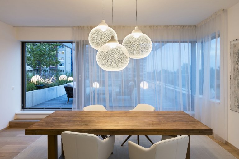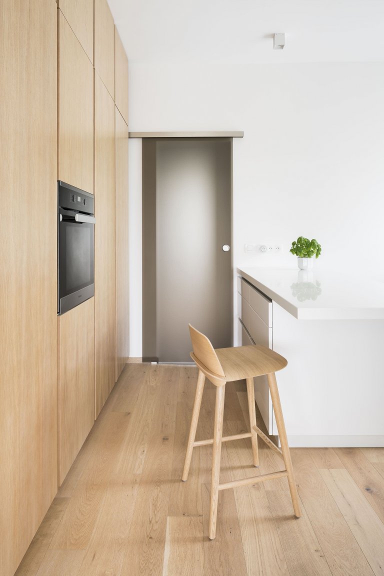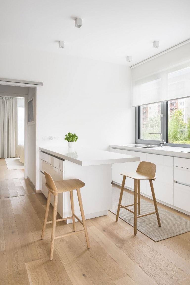 V obývacím pokoji spojeném s jídelnou, stejně jako v přilehlé kuchyni, není místo, ze kterého by člověk neměl možnost relaxovat při pohledu na zeleň. Byt se stal oázou světla, měnící atmosféru přírodních materiálů během dne a základní čistotou architektonicky dominantní bílé barvy.