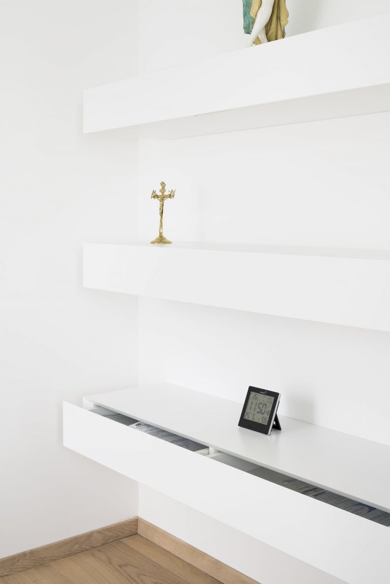 Ergonomicky tvarovaná kuchyně tvoří logistický uzel mezi ložnicí a obývacím pokojem a využívá vizuálního kontaktu se zahradou. Naopak, noční soukromá zóna je od veřejnosti oddělena posuvnými dveřmi z neprůhledného skla. Je tak snadné dosáhnout soukromí nebo maximálního otevření uspořádání - komunikace a přirozeného toku mezi ložnicí přes kuchyň k jídelně a obývacím pokoji. Tmavší difúze dveří je dalším kontrastem bílé kuchyně a úložného prostoru. Knihovna, regály se skrytými zásuvkami, chodbami a kuchyňskými skříněmi jsou vyrobeny z hladkých nebo profilovaných frézovaných dřevotřískových desek lakovaných v bílé barvě. V kuchyni jsou skladovací dveře dřevěné, v ložnici pokryté prošívanou umělou kůží.