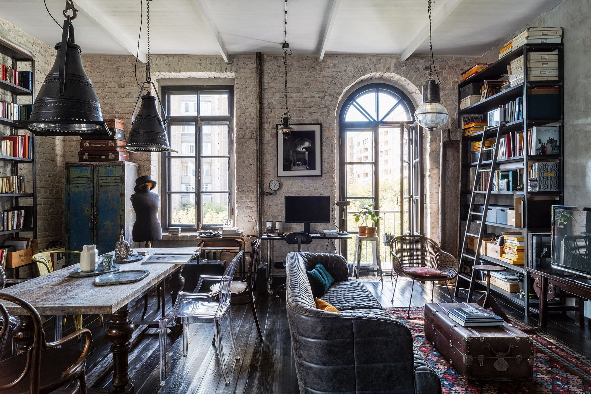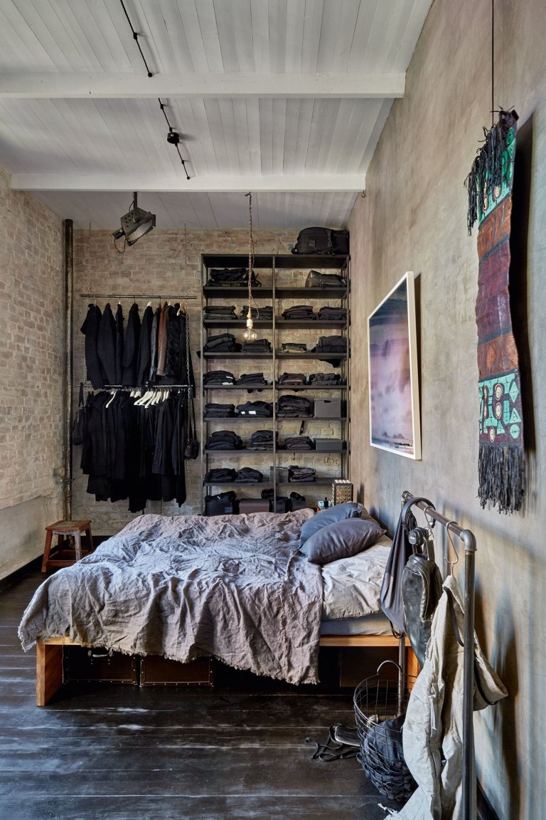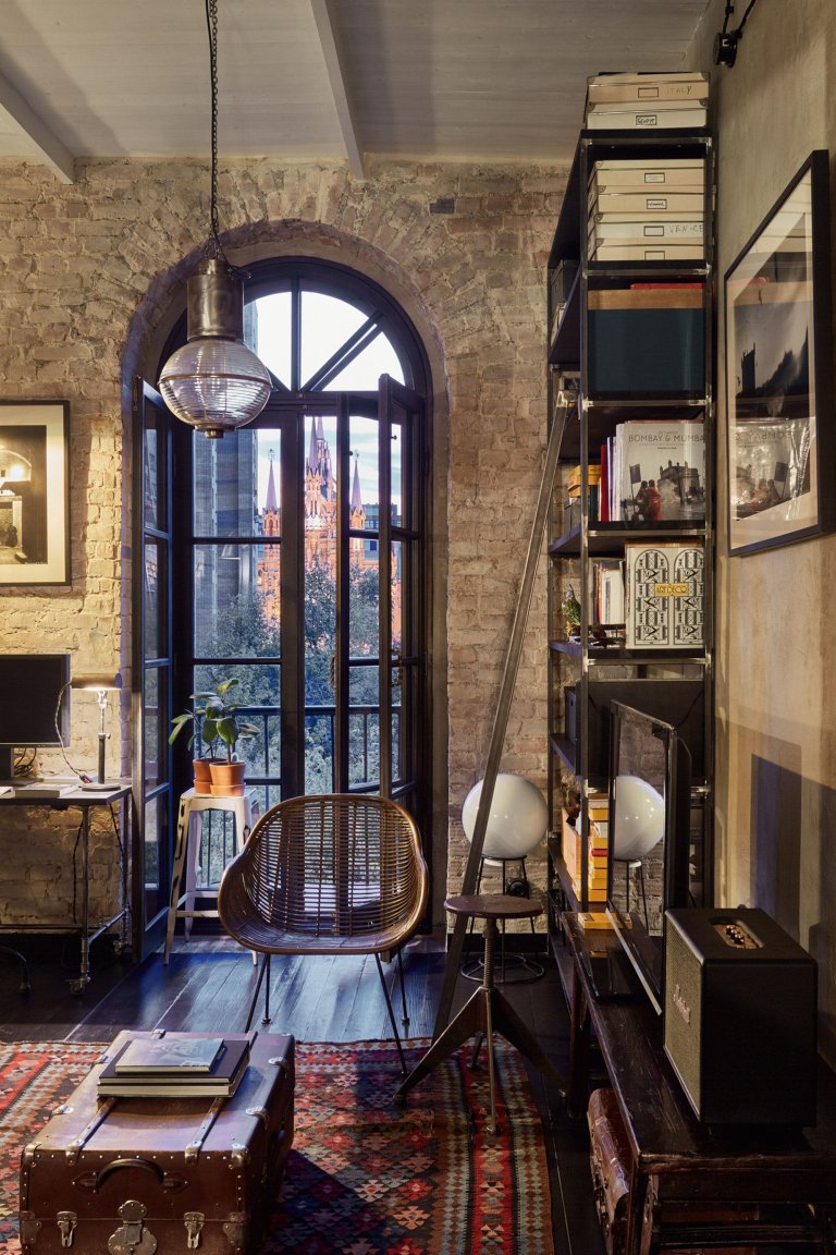 Z tohoto interiéru osobitost, originalita a odvaha doslova prýští. O divoké experimenty tu není nouze, přesto ale vzniká příjemné místo pro život. Příjemné ovšem pro ty, kteří si libují v temnějších tónech. Bydlení, jehož tmavé tóny rozsvěcuje jen přiznaná cihlová zeď, pár designových prvků a především dechberoucí výhledy z velkých úzkých oken, si majitel přál. Dodává mu totiž dostatek soukromí a inspirace pro tvůrčí práci. Prostředí bytu je navíc o to autentičtější, protože nemrhá zářivými barvami a jakoby setrvává v časech dávno minulých, které vychází vstříc vkusu a myšlení umělecky zaměřeného člověka.