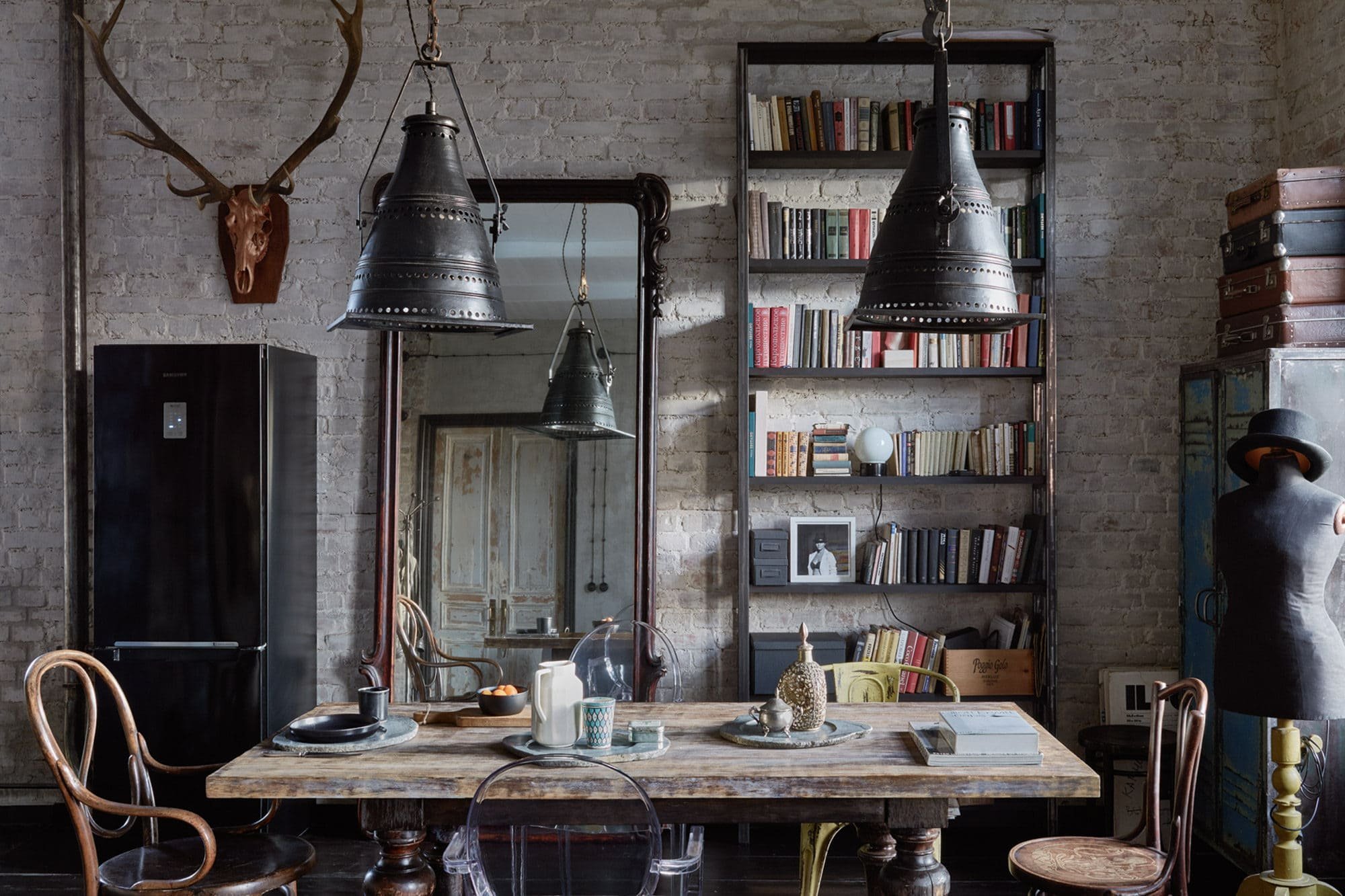 V bytě v srdci Moskvy, který zaujímá plochu o velikosti 82 m2, zaujme zdánlivě nesourodá kombinace několika interiérových stylů. Těmi dominantními jsou vintage a industriální styl, které v sobě pojí lásku k romantické minulosti i funkčnosti bez příkras. Vzniká tak bydlení, které je ryze mužskou záležitostí, přesto v něm ale nechybí ani jemné komponenty. V dokonalé symbióze tak v interiéru vedle sebe spočívají křišťálové lustry, velká zrcadla s ozdobnými rámy, mozaikové dlažby, rustikální umyvadla, nostalgické pásy nesmrtelných luxferů, industriální svítidla, historizující stolky, kovové stojany a regály, vzorované koberce a tapisérie či staré cestovní truhly. Mix několika stylů uvnitř interiéru fotografa funguje dokonale a je patrný už jenom při pohledu na různorodé židle rozestavěné kolem jídelního stolu.