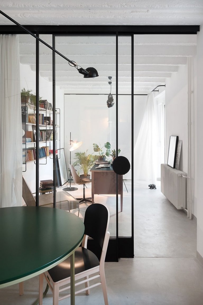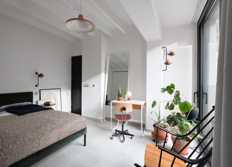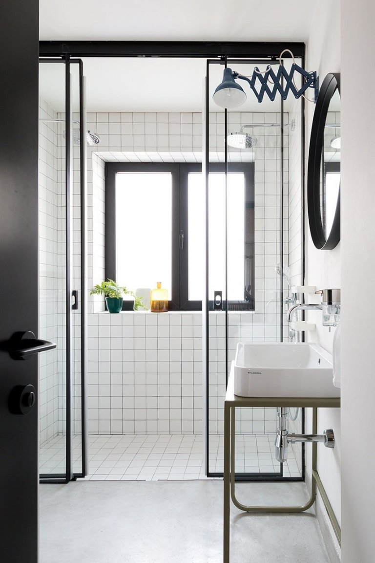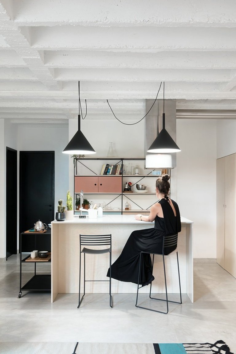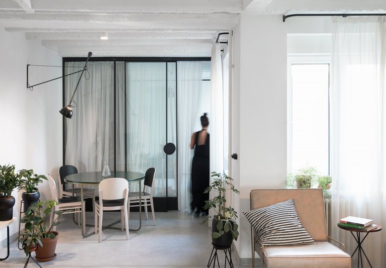 Co se týče materiálového řešení, autoři designu spolu s majiteli vybrali jednoduché a účelné varianty. Podlaha je z leštěného betonu, nad jednolitými bílými stěnami vládne originální "avramenko" strop, který byl předešlým obyvatelům zakrytý a znovuobjevený při rekonstrukci. Mírně industriální nádech, který tomuto prostoru dodává právě strop a podlaha je umocněn osvětlením, kuchyňskou úložnou sestavou či jednoduchými černými rámy oken, balkonových dveří a sprchového koutu.