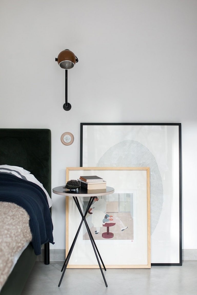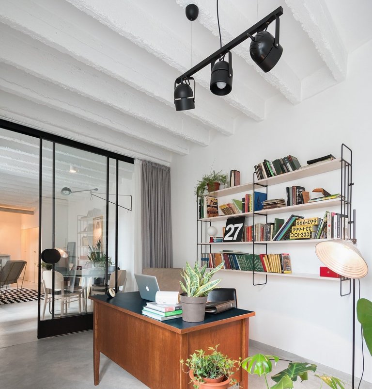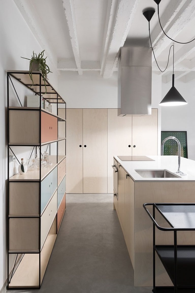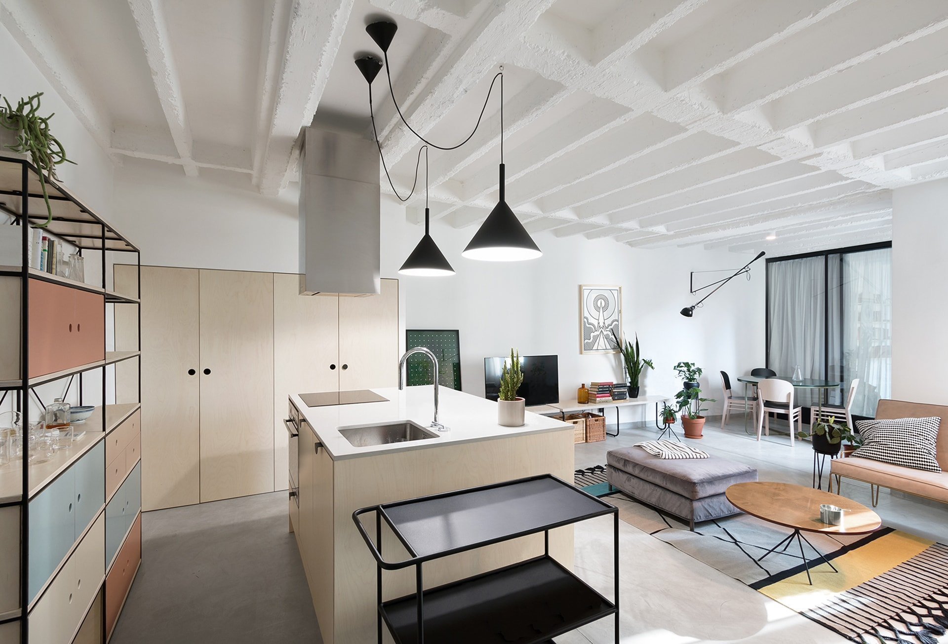 Co se týče materiálového řešení, autoři designu spolu s majiteli vybrali jednoduché a účelné varianty. Podlaha je z leštěného betonu, nad jednolitými bílými stěnami vládne originální "avramenko" strop, který byl předešlým obyvatelům zakrytý a znovuobjevený při rekonstrukci. Mírně industriální nádech, který tomuto prostoru dodává právě strop a podlaha je umocněn osvětlením, kuchyňskou úložnou sestavou či jednoduchými černými rámy oken, balkonových dveří a sprchového koutu.