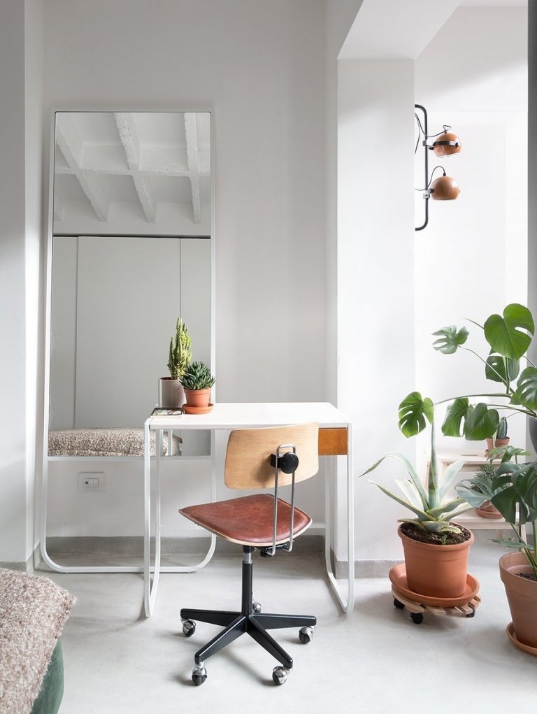 Jednoduché a čisté linie interiéru výborně doplňují všudypřítomné pokojové rostliny, jednoduché dekorace a textilie v kontrastních barvách a vzorech. Černé dveře spolu se zmíněnými černými rámy dveří a oken opticky člení prostor v protikladu k jednolitým sněhobílým stěnám.