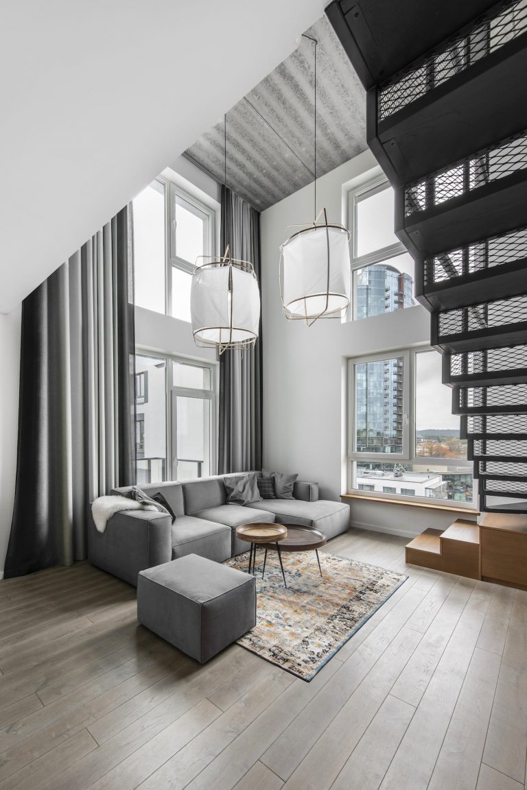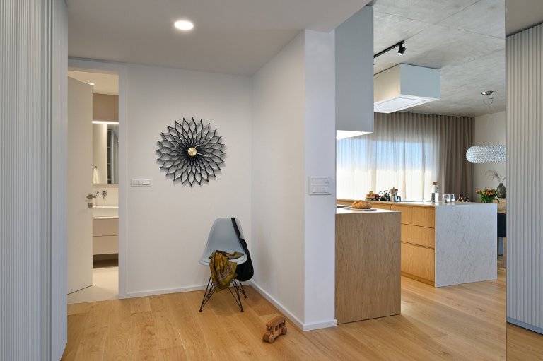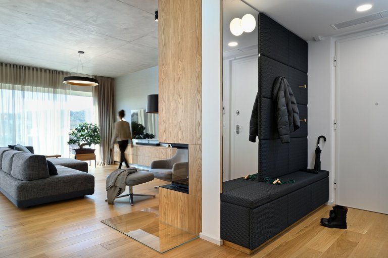 Vzhledem k tomu, že části budovy byly navrženy v betonu, designérky se rozhodly zachovat její primární vzhled také v centrálním obytném prostoru. Surový beton na jedné straně a teplé dřevo jako protiváha na straně druhé dodávají bytu jedinečný charakter. Definují rovněž linii kontrastů, která se táhne napříč jednotlivými místnostmi.