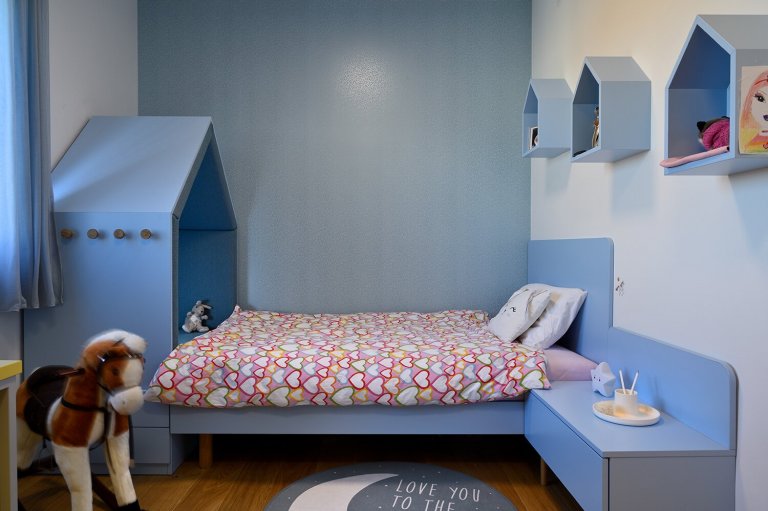 Spací část je zevnitř oddělená od obývacího pokoje, je s ním však spojená po vnějším obvodu. Hlavní ložnice se totiž otevírá na velkou terasu, která je propojená s hlavní terasou. K té je přístup přímo z obývacího pokoje. Terasa zaujímá plochu 50 m2 a představuje opravdovou oázu uprostřed města v horkých dnech. Ložnice je zařízena čistě minimalisticky a navazuje na ni koupelna obdobného rázu. Ozdobou tohoto prostoru je velké okno stíněné elegantními závěsy, moderní obraz a designový lustr. Skutečnou potěchou pro oko jsou pak dva dětské pokoje, ve kterých se fantazií opravdu nešetřilo.