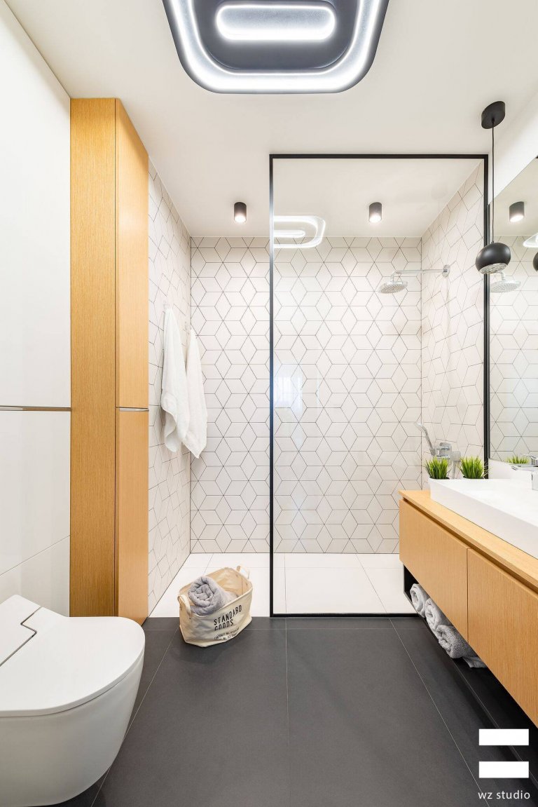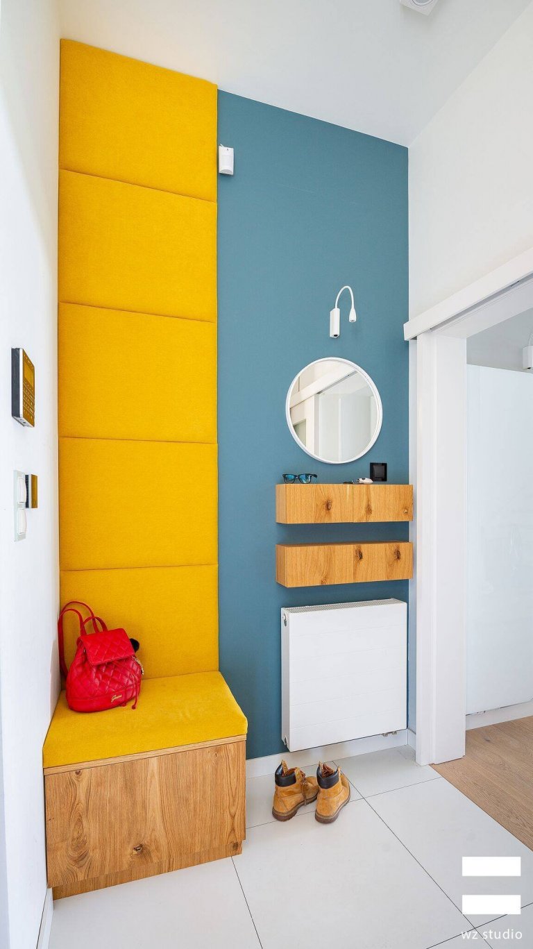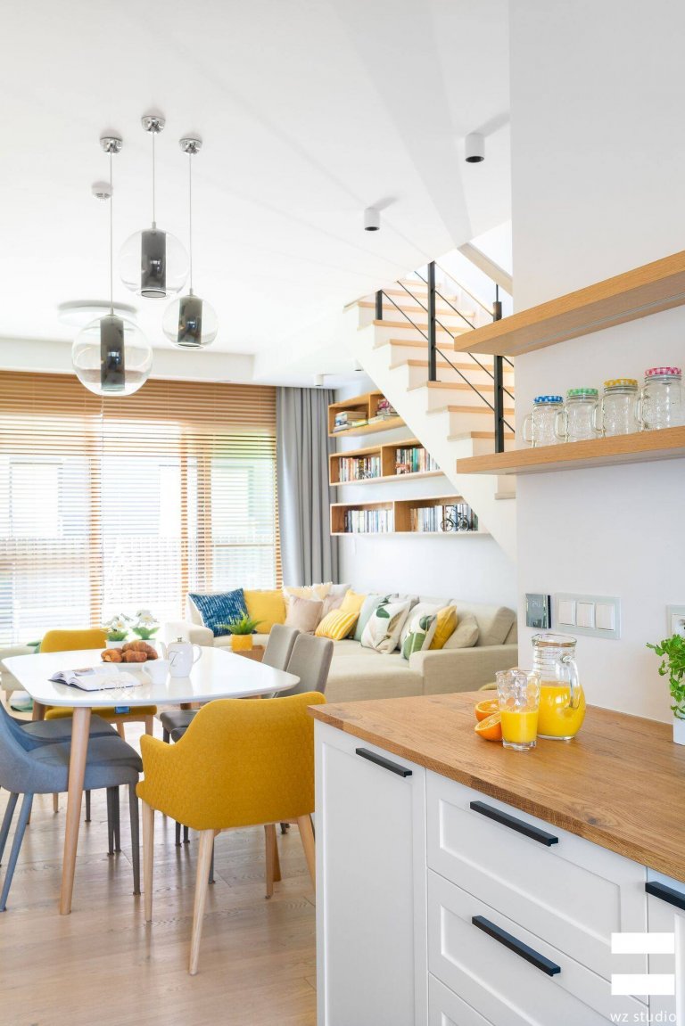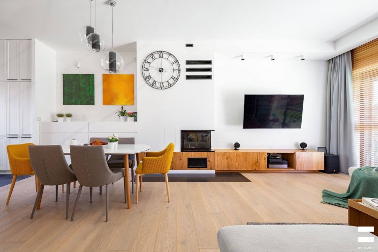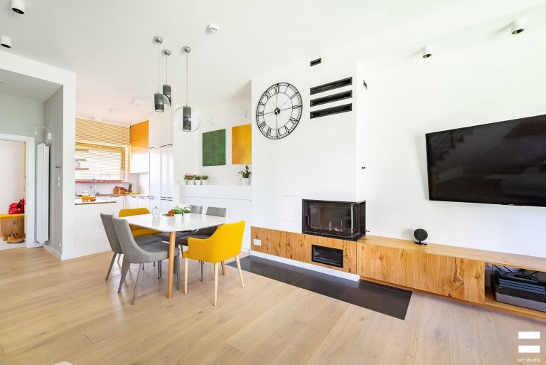 Za interiérem polského domu stojí architekti ze společnosti WZ Studio, kterým se podařilo vytvořit prostor plný světla, barev i zajímavých designových prvků. Světlo sem prostupuje dostatečně velkými okny, která v případě potřeby stíní žaluzie barevně korespondující s odstíny dřeva, jež je v interiéru hojně zastoupeno. To si libuje ve své přirozenosti a na první pohled zaujme překrásnou texturou. Hřejivý dojem z interiéru umocňují doplňky v jasně žluté, zelené nebo modré barvě, které celému bydlení dodávají na svěžesti a dynamice. Prostor zde dostává i bílá, šedá a černá barva. Ty jsou využity s citem, a tak nenarušují živelnou barevnost celku, jen ji místy příjemně zklidňují.