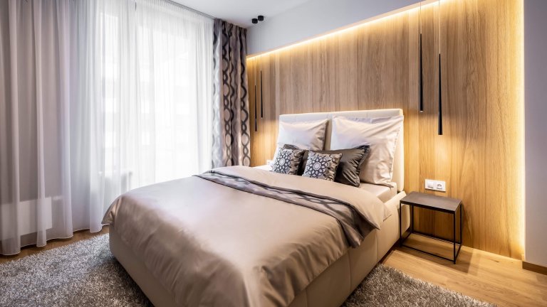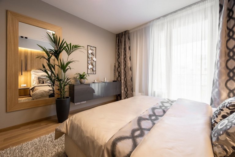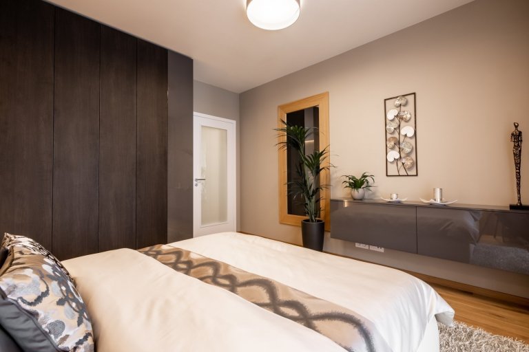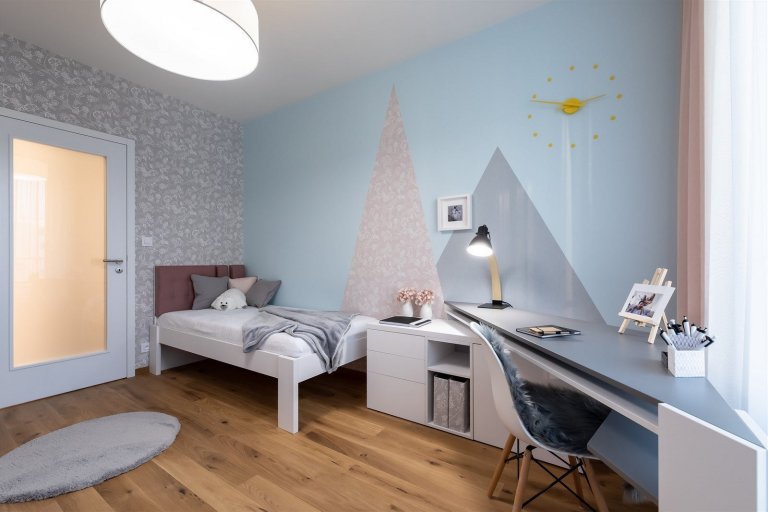Barvy a materiály typické pro celý byt se objevují také v ložnici. V té se propojují materiály masivního dubu a dýhy na podlaze, obkladu za čelem postele i na masivním rámu zrcadla. Skříňky a noční stolky zaujmou tmavě šedým wenge dekorem v kombinaci s lakovanými prvky. O hřejivý dojem se starají především textilie, které perfektně ladí s výmalbou i nábytkem v celé ložnici. Co se týče dětského pokoje, v něm se mnohem více dostávají ke slovu světlé barvy. Stěžejní je tu především hra s tapetami, jejich barvami a motivy. Ve starorůžové a jemně šedé barvě na sebe nádherně navazují a navíc příjemně ladí s bílými prvky v pokoji. Celek tak vypadá neskutečně jemně a něžně. Zajímavosti přitom neujde ani atypicky řešený psací stůl.