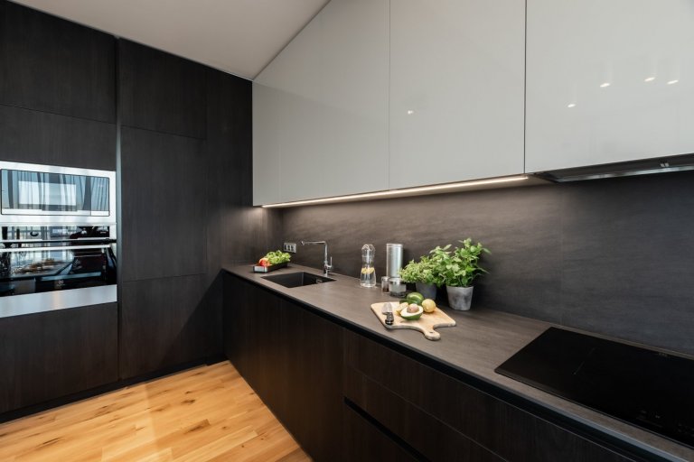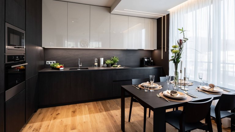 Vzorový byt v Rezidenci Waltrovka je důkazem toho, že i tmavý interiér může působit útulně a elegantně. Kráčí tak proti proudu českých interiérů, ve kterých převažuje bílá barva. Za svůj luxusní vzhled přitom vděčí mimo jiné kvalitním materiálům a atypickým prvkům, které spoludotvářejí osobitý charakter interiéru.