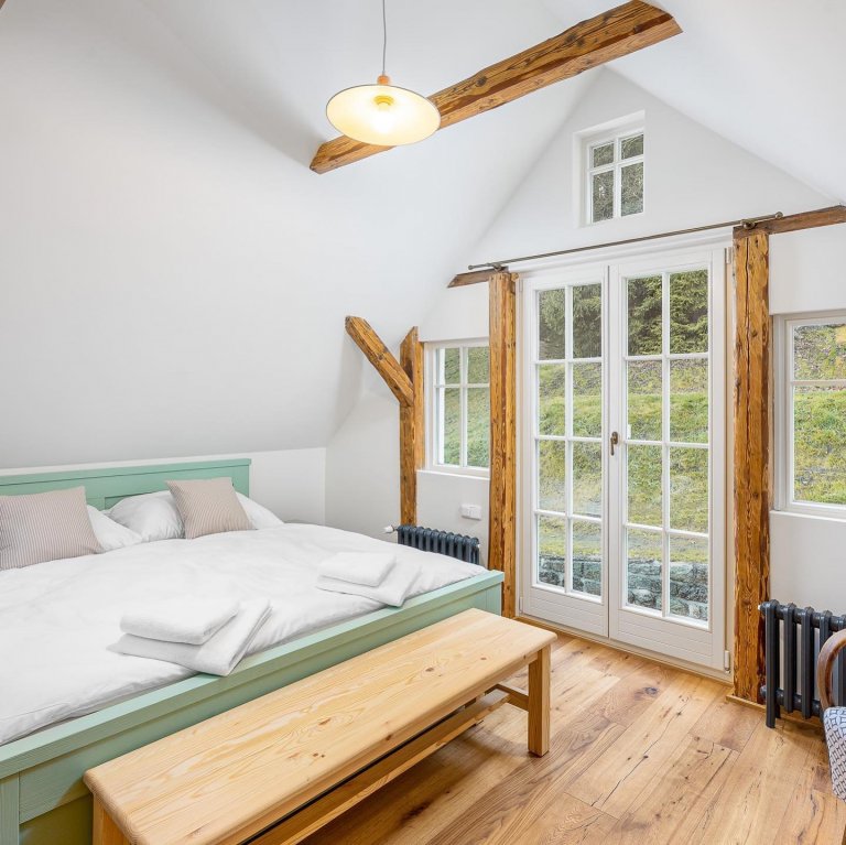 Chalupa, která se může stát půvabným místem pro vaši dovolenou, ukrývá naprosto kouzelný interiér. Jakmile sem dorazíte, tak vás sami majitelé tímto interiérem provedou a povypráví vám o historii sklářské chalupy i o jejím pozoruhodném okolí. Po náročné cestě si můžete odpočinout v jedné ze čtyř rozkošně zařízených ložnic, ve kterých se spí jako v pohádce. Zrána vás přivítá zpěv ptáků a také čistě bílá koupelna volající po očistě. Tady vás jistě zaujmou překrásné dlaždice s nádechem starých časů a působivá kresba dřeva vystupující z bílého pozadí. Každý z pokojů vám přitom nabídne jiný, ale dostatečně malebný výhled do okolí. Jako mávnutím kouzelného proutku zavítáte do časů svých babiček, abyste si vychutnali chvíle strávené na chalupě do posledního doušku…