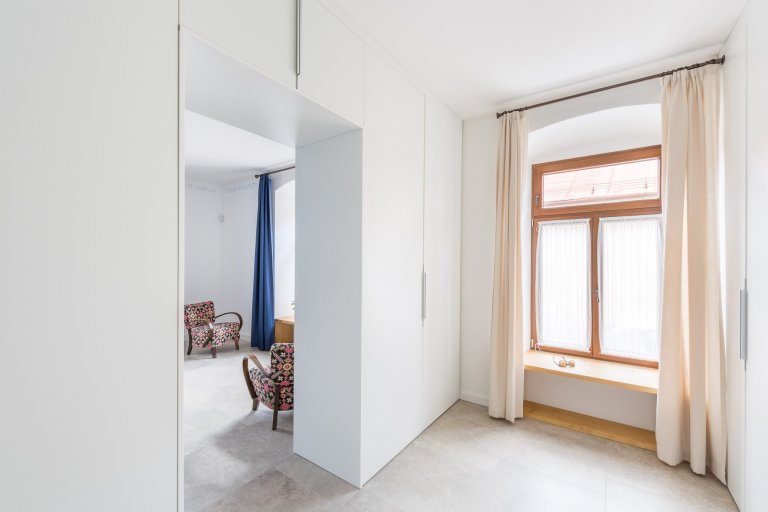Architektonické řešení přináší do všech podlaží velkorysé prostory, v přízemí co nejvíce vzájemně propojeny, s rozvážně navrženým nábytkem a potřebným zařízením, kde nic není navíc. Do objektu se, stejně jako původně, vstupuje z jižní strany - z ulice. Některé z vnitřních prostor se vizuálně a dispozičně propojili. Na vstupní halu navazují prostory kuchyně. Oproti se nachází nové dřevěné schodiště vedoucí do podkroví. Nalevo se nachází vstup do obývacího prostoru.