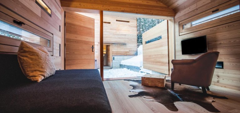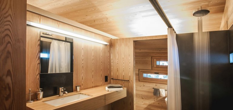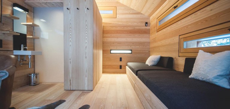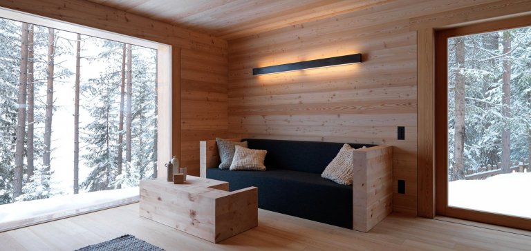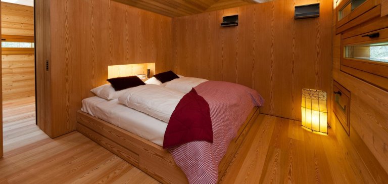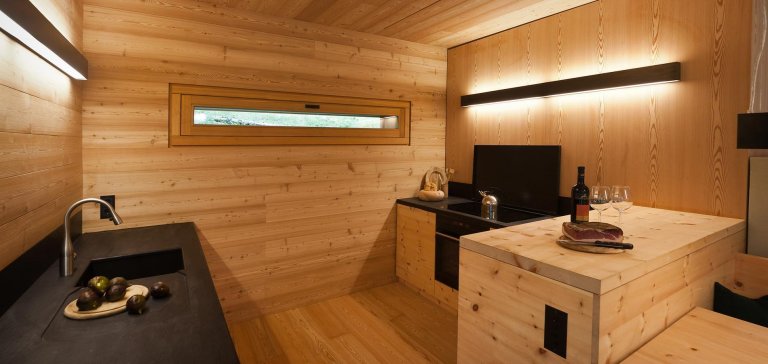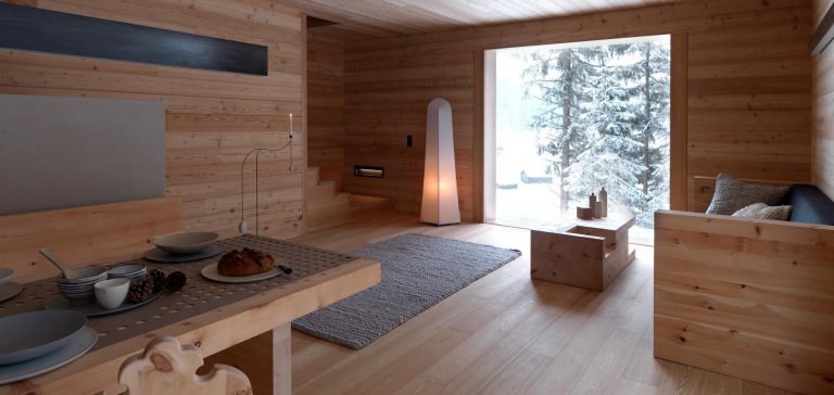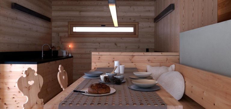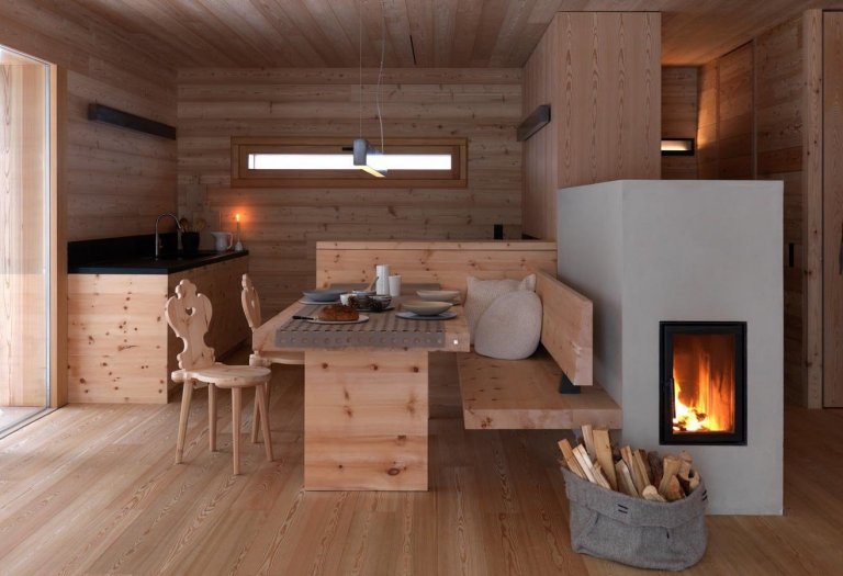 Ač se to nezdá, zařízení interiéru vychází z alpských tradic. Obložení stěn i veškeré vybavení je zcela dřevěné. Prim hrají strohé linie, minimalistický design a čistě praktické provedení. V obývacím pokoji nechybí hřejivý krb a lavice k posezení. U jídelního stolu upoutají pozornost tradiční lidové židle s tyrolským vzorem, které jsou jediným ozdobným prvkem jinak čistého interiéru. K příjemnému odpočinku zde však nechybí vůbec nic...