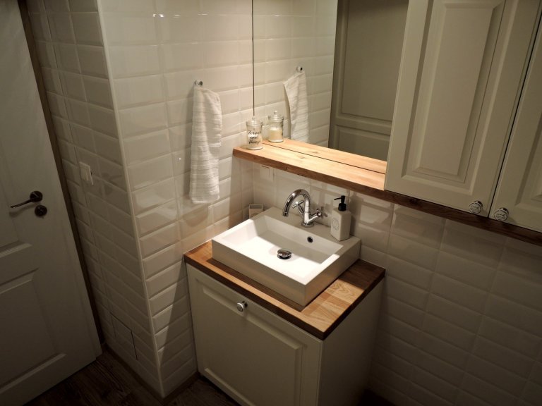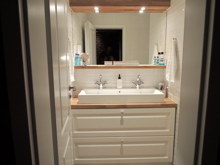 Ještě před samotným zařizováním bylo třeba udělat spoustu dalších úkonů. Jako první šlo o předělávky elektřiny tak, aby vyhovovaly uspořádání bytu. To samé platilo o posuvu hydroinstalace. Podlahu tvoří biokompozit (kombinace dřeva s plastem), který je voděodolný – proto byl využit i v koupelně. Většina nábytku v bytě je zhotovena na míru. Od skříní, přes stoly až po kuchyňskou linku. Díky tomu spolu vše krásně ladí.