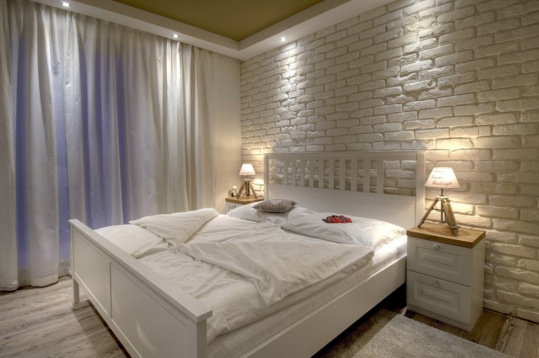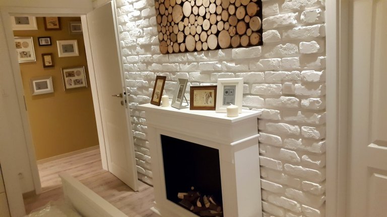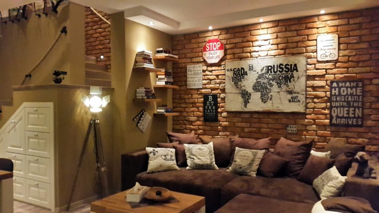 Posledním velmi výrazným prvkem jsou cihlové obklady na stěnách. Ty najdeme ve všech místnostech, které byt má. I zde se majitel nespokojil s pouhou replikou. Na obklad byly použity odřezky skutečných cihel, které bylo třeba do bytu nanosit (měly více než dvě tuny), opláchnout a okartáčovat. Dále byly nalepeny na stěny a zaspárovány. V ložnici byly ještě namalovány na bílo. Šlo o něco, co zabralo spoustu času, avšak výsledek stojí za to.