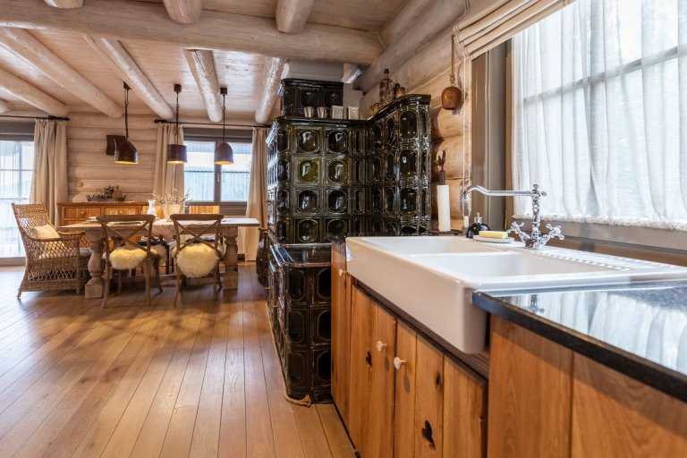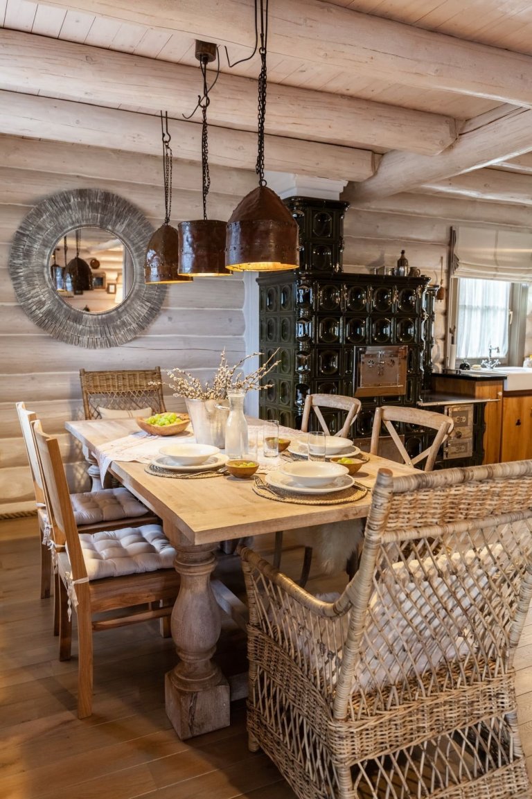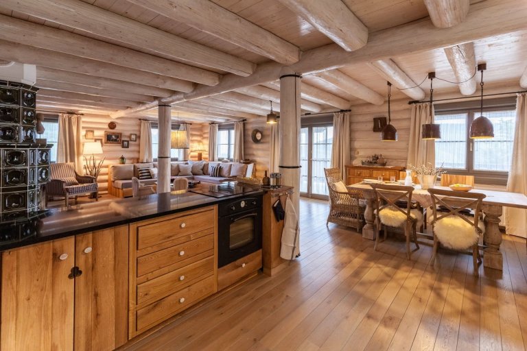 Svým rustikálním stylem zaujme také kuchyně, která byla původně od obývací zóny oddělena polopříčkou. Díky jejímu odstranění došlo ke zvětšení kuchyně. Tu po praktické i estetické stránce doplňuje dlouhý ostrůvek s integrovanými kuchyňskými spotřebiči. Celý prostor kuchyně a jídelny tak vypadá čistě a minimalisticky. Plnou měrou tedy mohou vyniknout jednotlivé doplňky a textilie. Perlou této části interiéru jsou ovšem překrásná kamna stojící poblíž kuchyňské linky z masivního dubu a kamene. Z důvodu, aby uvnitř srubu nepřevládalo dřevo více, než je potřeba, hraje zde velkou roli i nábytek a doplňky z proutí. Ty celek zjemňují a dodávají mu romantičtější nádech.