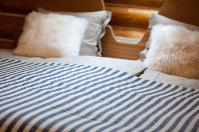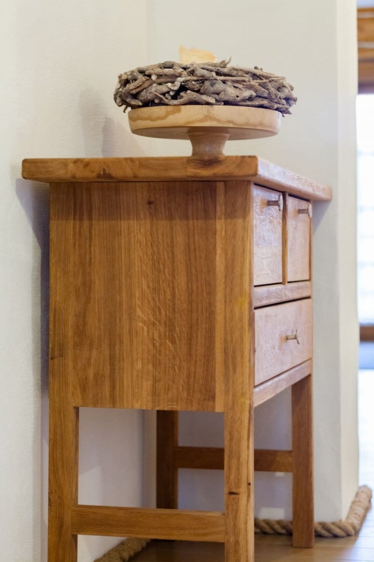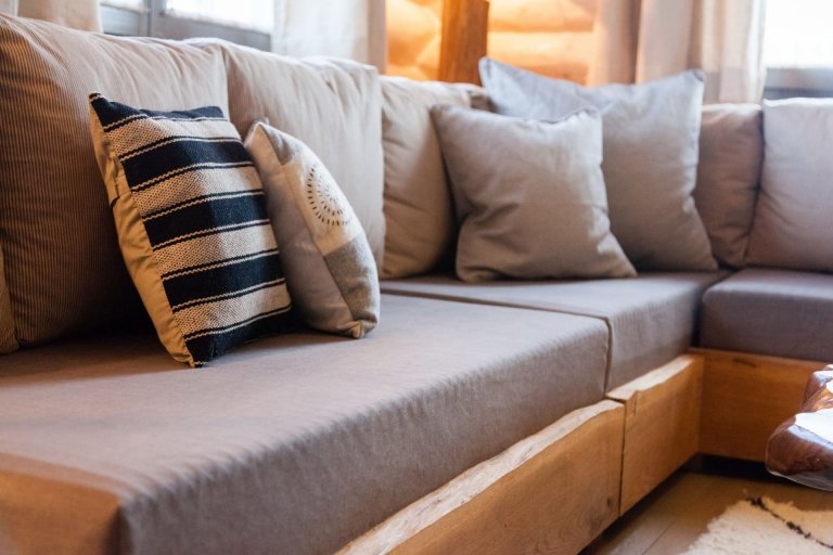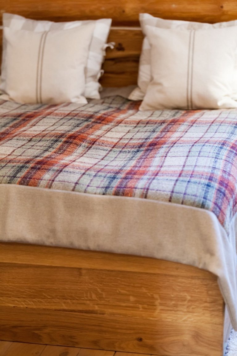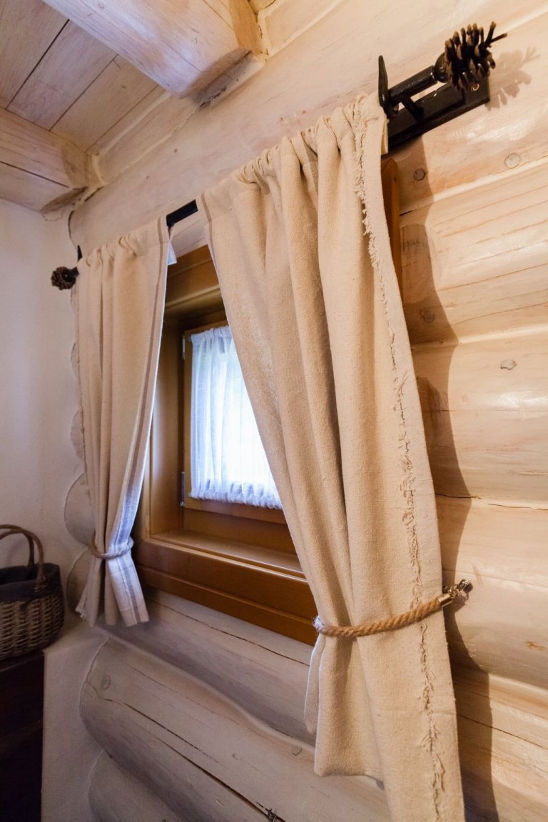 Ve srubu hrají hlavní roli přírodní materiály. Kromě dřeva zde vládnou vlna, bavlna, len, kožešiny a naplavené dříví z Dunaje. V interiéru tak vznikla neskutečně hřejivá, útulná atmosféra vonící dřevem a vybízející k odpočinku. Bílá lazura na stěnách obytného prostoru si dobře rozumí s teplým šedým odstínem okenních rámů. Nachází se zde i vysoce komfortní sedací souprava vyrobená na míru. Stačí z ní odstranit polštáře a vznikne prostor pro spaní pro dvě osoby. V této odpočinkové obývací zóně zaujme celá řada zajímavě využitých přírodních materiálů. Stačí se podívat na zajímavý konferenční stolek, lampy či rámy obrazů. Díky tomu, že je v celém interiéru srubu většina zařízení vyrobena na míru, působí celý prostor jednotně a v kombinaci se zvolenými textiliemi i velice útulně.