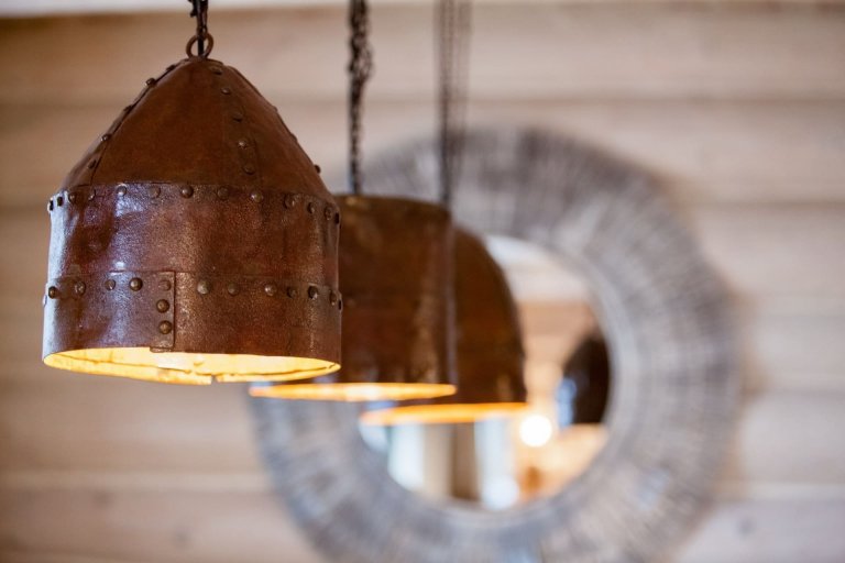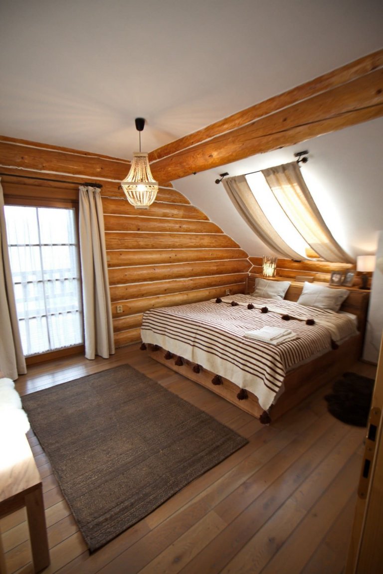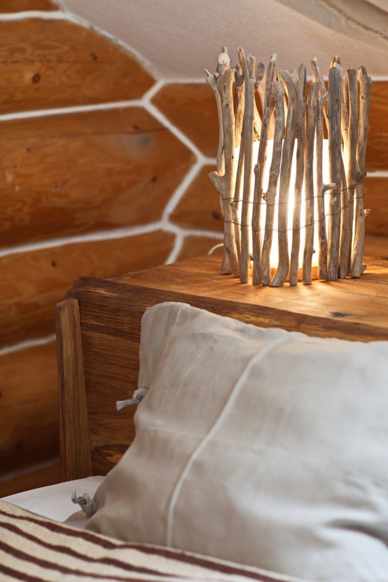 Interiér srubu je promyšlen do posledního detailu. Svou přirozenou krásou jej osvěžují především ty kusy vybavení, jejichž základem je dřevo vyplavené při povodních z Dunaje.. K těmto specifickým prvkům patří svítidla, hodiny, rámy obrazů či noční stolky. Všechny jsou dílem designérky Želmíry Habalové, která tak dokazuje, že neopakovatelný rukopis přírody dokáže z každého kousku vytvořit základ unikátního díla. Cit pro detail je však znát i z celé řady dalšího vybavení tohoto neobyčejného interiéru, ať už se jedná o stoličky, zrcadla, svítidla či nástěnné dekorace.