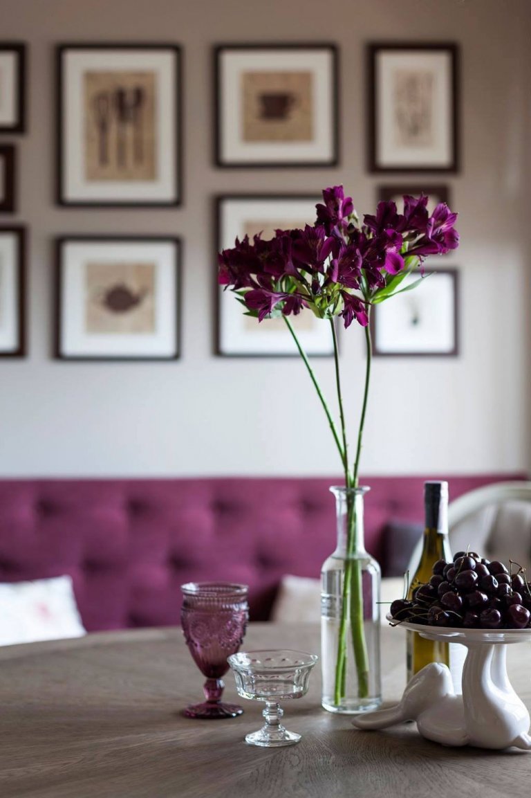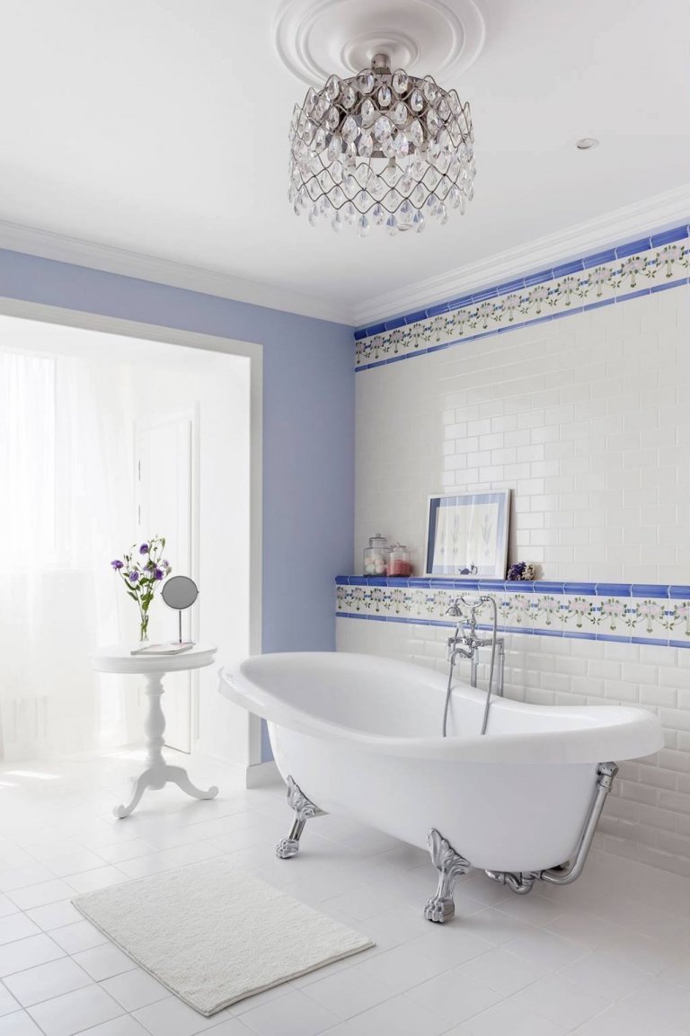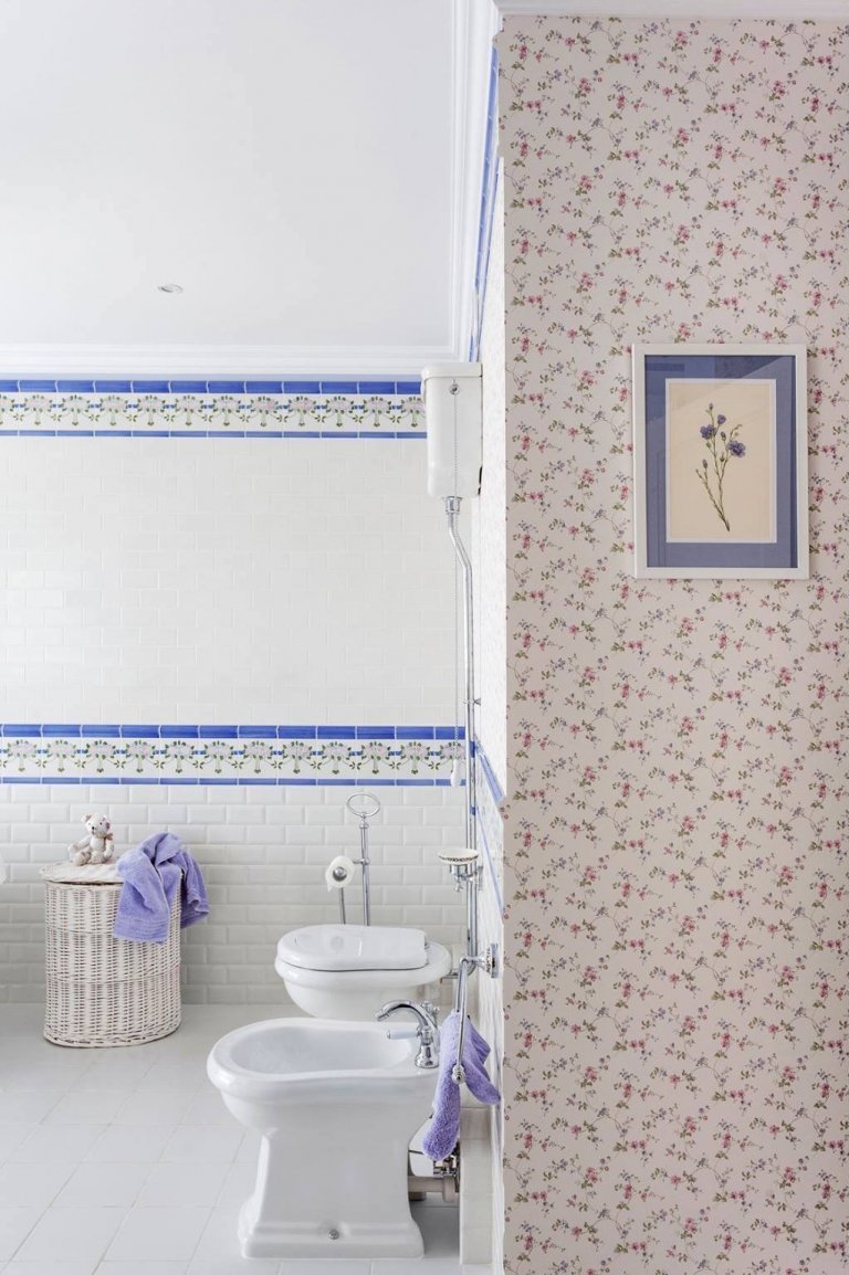 Tento byt luxusně vyvedený ve stylu francouzského venkova myslí na detaily, a tak je od ložnice až po toaletu posetý jemnými romantickými motivy. Ty působí decentním a nevtíravým dojmem, takže se zdaleka nemusí jednat o bydlení výhradně pro dámy. Romantická růžová barva je zde příhodně nahrazena fuchsiovou barvou, která se promítá na posteli v první ložnici, na pohovce v kuchyni, ale také v barvě sklenky či řezaných alstromérií v kuchyni. Velmi působivé je pak využití jemné modré a fialové barvy, jež přímo odkazuje na provensálský nádech celého obydlí. Modré a fialové odstíny prohřívají převážně bílý interiér a dodávají mu dotek luxusu. Nad volně stojící vanou s historickými nožičkami v první koupelně tak spatříte dva pásy levandulového lemování oddělené bílými obklady. Celkový něžný ráz pak v první i v druhé koupelně propojují tapety s jemnými květinovými vzory. Druhé koupelně a toaletě vládne na pohled příjemná kávová barva, druhá ložnice je laděna do krémové. Polštářky v krémové barvě jsou umně namíchány s těmi s květinovými motivy. Květy se objevují i na typicky venkovském volně stojícím umyvadle u toalety.