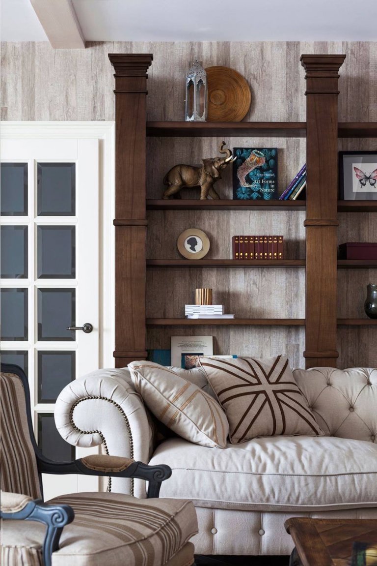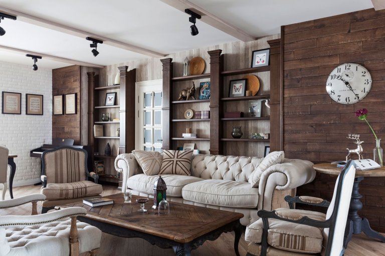 Zatímco v těchto místnostech proniká historický styl jen po špičkách a v převážně bílé barvě, v obývacím pokoji už dýchá naplno. Tmavé dřevěné obložení, majestátní police na knihy a suvenýry z cest, obrazy, hodiny, ale také ozdobné nohy stolů, vydatně polstrovaná křesla a pohovka jako symbol pohodlí obývacího pokoje – to všechno dává této místnosti ráz koloniálního stylu.