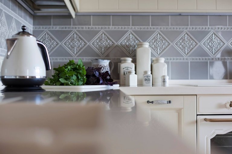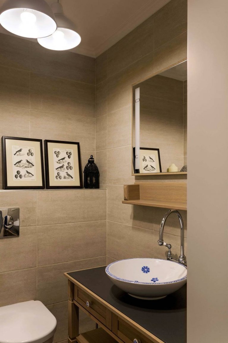 Velkou devízou tohoto bytu ve stylu francouzského venkova je precizní hra s detaily, s barvami a úžasný cit pro jejich kombinaci. Díky tomuto umění designérů mohou v jednom bytě svorně pobývat křišťálové lustry, malovaná umyvadla, proutěné košíky, robustní křesla i mnoho dalšího, co se zde tak umně spojilo v jediný honosný celek.
