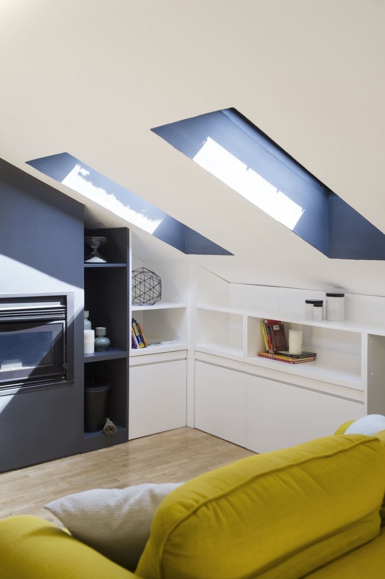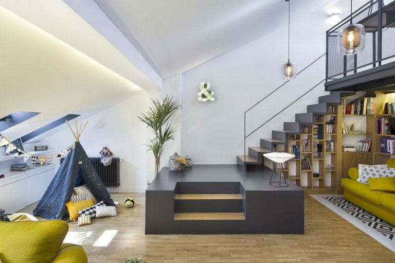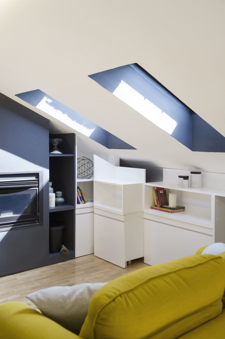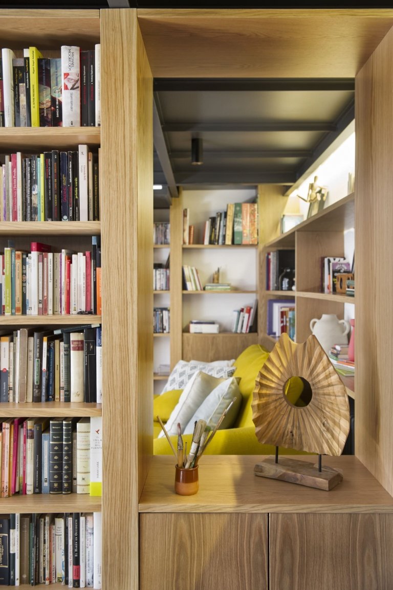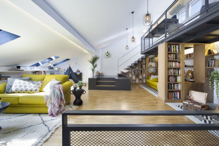 Půdní prostor s velkým potenciálem využívali madridští majitelé zprvu jako skladiště, díky architektům ze studia Egue y Seta však nově získali příjemných 97 m² plochy, která se proměnila v plnohodnotnou část domácnosti. Ta zaujme nejen bohatě zásobenou knihovnou, ale i svěžími akcenty jasně žluté barvy.