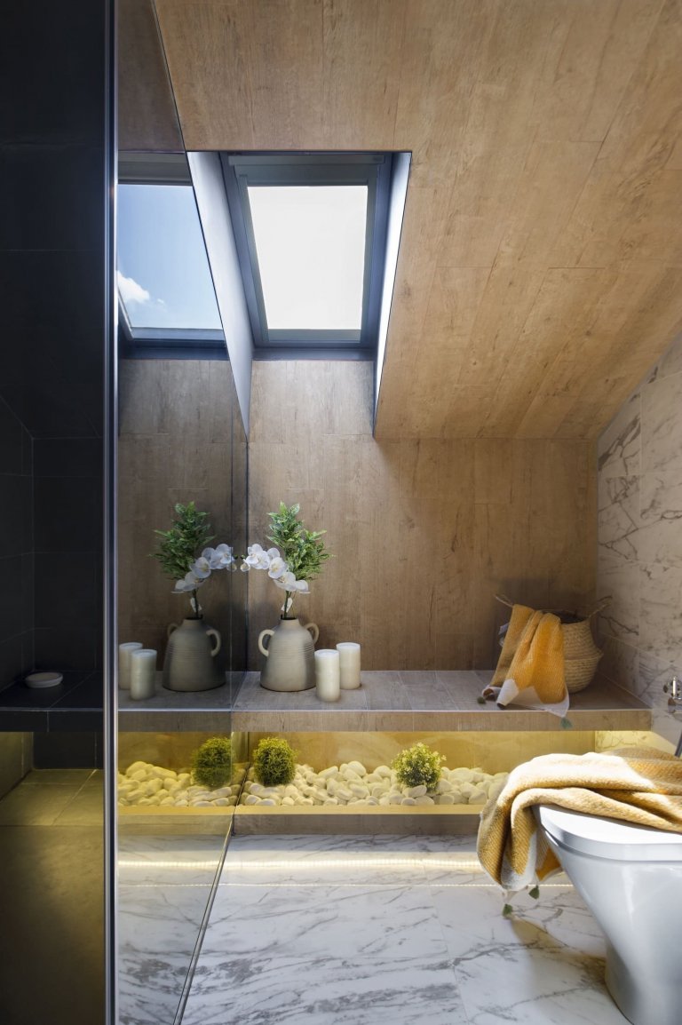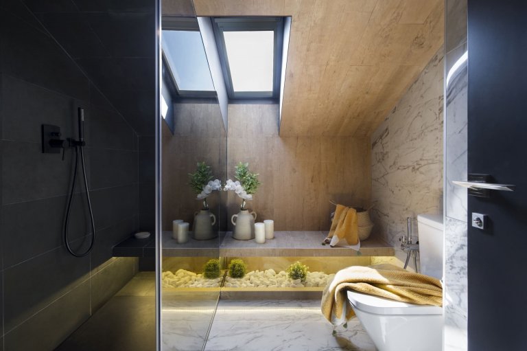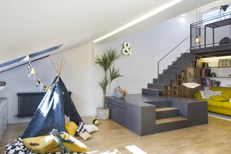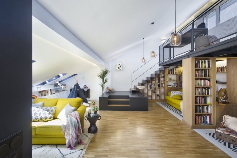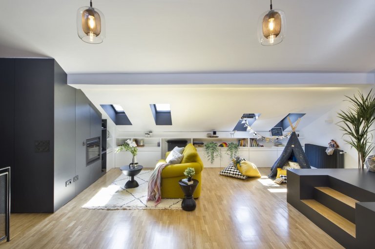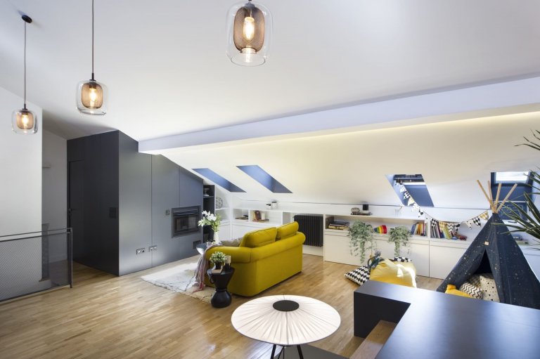 V bývalém půdním prostoru vzniklo příjemné prostředí, které se rázem stalo srdcem domova. Navíc v sobě ukrývá řadu zajímavých řešení. K těm patří například umělecký koutek se sedací soupravou umístěný pod loftem či koupelna důmyslně skrytá v šedém boxu. V jejím interiéru přibyl k paletě barev luxusně vyhlížející mramor. Celým interiérem podkrovního bydlení se přitom táhne zajímavá kombinace bílé, šedé a žluté barvy, jež doplňují přírodní tóny dřeva. Horní část bytu zaujme navzdory svažující se střeše svým moderním a velmi vzdušným dojmem. Znovuzrozený prostor ozvláštňuje řada pozoruhodných prvků, ke kterým patří například dětské teepee, netradiční konferenční stolky, designová svítidla či barevné textilie s různými motivy. Celý interiér podkrovního bytu navíc příjemně rozjasňují akcenty jasně žluté barvy, které prostoru dodávají tu správnou svěžest a styl.