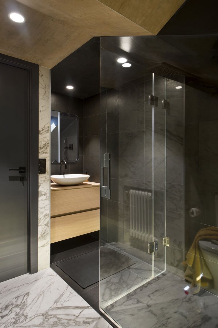 Po schodech se ze spodní a plnohodnotně využívané části bytu vchází na půdu. Architekti vyšli obyvatelům vstříc a z doposud zanedbávaných půdních prostorů vytvořili kouzelné místo pro život. Využili velkého potenciálu horního podlaží, ze kterého se jim podařilo vytvořit téměř triplex, tedy prostor se třemi podlažími přístupnými z jedné vodorovné komunikace. Původní odkladiště má totiž navíc loft. Ten funguje jako pracovna či studovna, přičemž nabízí přehled o tom, co se děje v hlavní zóně dole. Tento prostor umístěný v nejvyšší úrovni bytu je zároveň tím nejklidnějším. Na loft vede zajímavě řešené schodiště se šedým čtvercovým soklem, který slouží jako jeho podesta. Současně je zajímavým prvkem, který ozvláštňuje už tak velice zajímavou atmosféru obývacího pokoje.