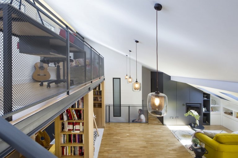 Pod taktovkou architektů se půdní prostor proměnil ve vzdušné, příjemné a moderní prostředí, které rázem ožilo díky svému vybavení včetně zajímavé kombinace materiálů a barev. V horní části bytu našel své místo komornější obývací pokoj doplněný o krbová kamna a příjemné posezení před bohatě zásobenou knihovnou. Knihy, umělecké artefakty a malířský stojan vůbec dodávají tomuto prostoru podmanivé intelektuální kouzlo. Jasně tak definují novou funkci tohoto kdysi zanedbaného místa, které nově získalo umělecký nádech. Členové rodiny si tak zde mohou nejen povídat, ale také strávit chvilku o samotě s knihou nebo nad malířským plátnem.