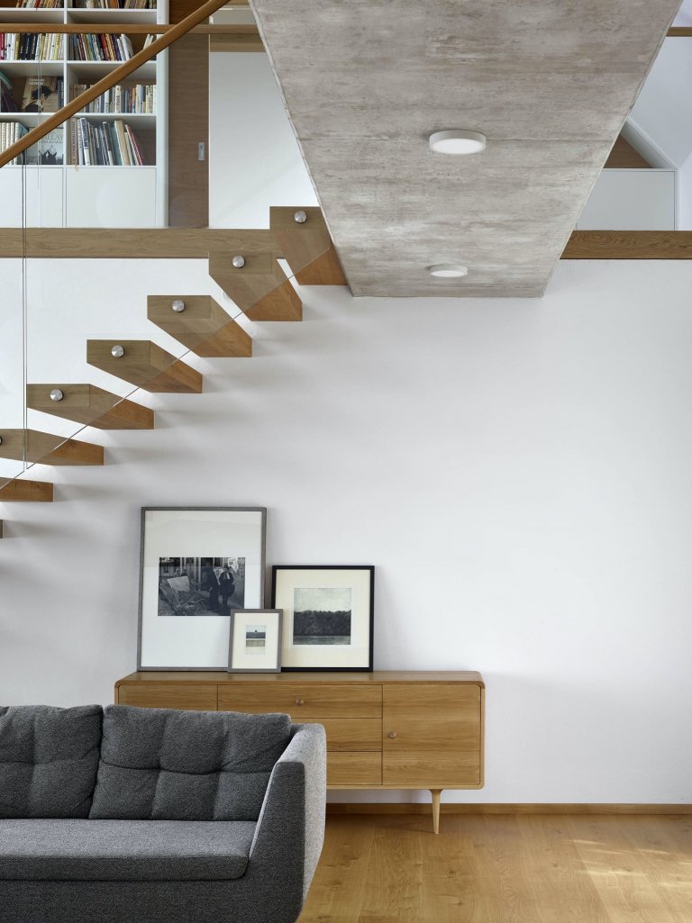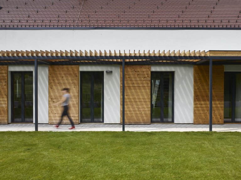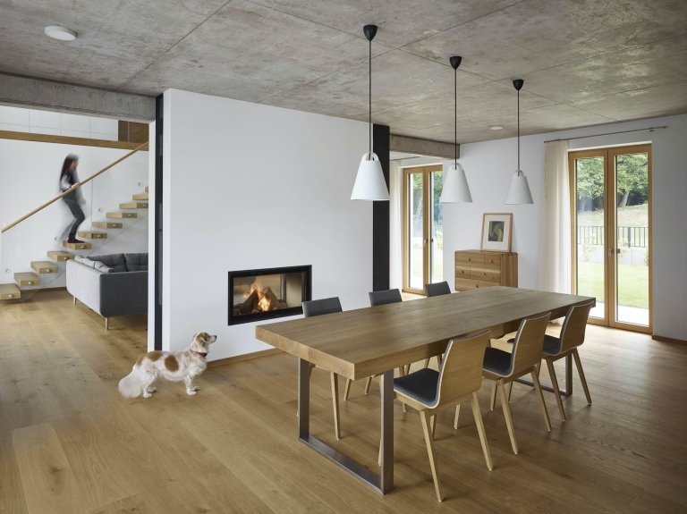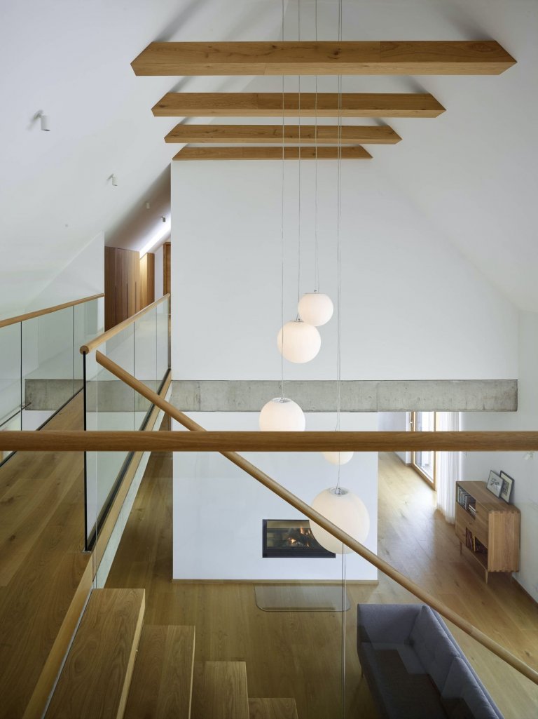 Zatímco charakter domu je současný a vystihující dnešní dobu, sedlové střechy a podélný půdorys připomínají tradiční obydlí typická pro tuto lokalitu. Díky přitažlivému mixu obojího se venkovskému domu přece jen daří zapadnout do zdejšího prostředí, z nějž je možné dohlédnout až na samotné podhůří Alp. Umožněno je to tím, že velký pozemek, na kterém dům stojí, směrem k lesu výrazně stoupá. Dům tak svou polohou v horní části parcely získal na možnosti překrásných výhledů do okolí.