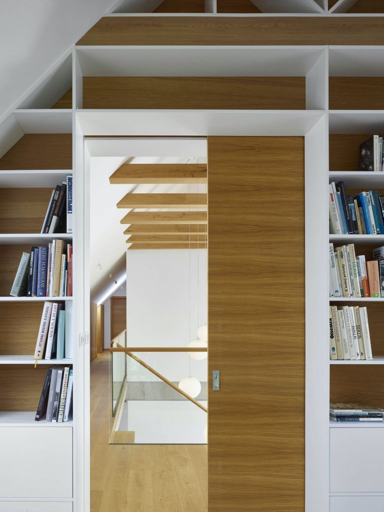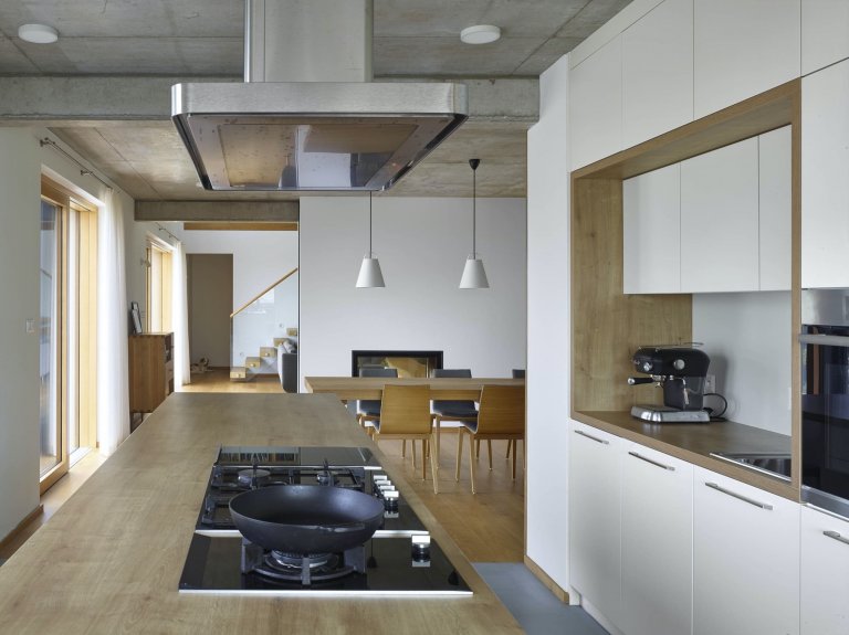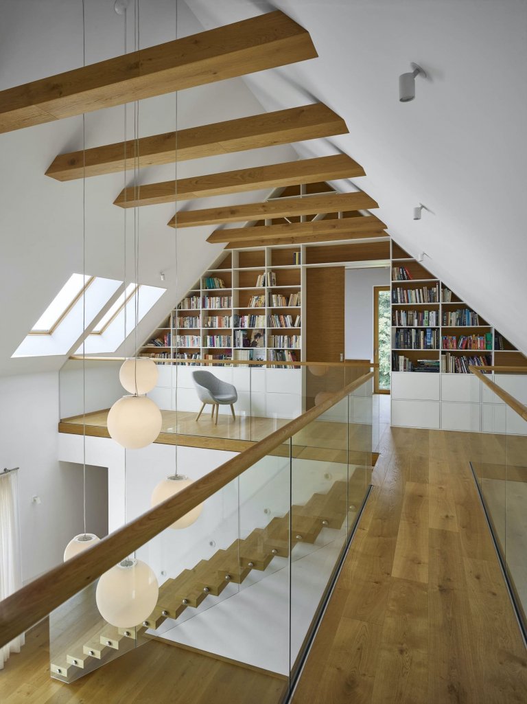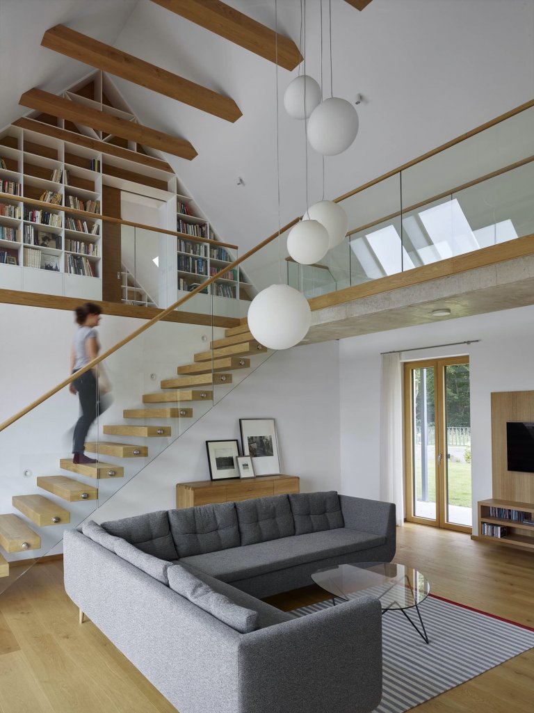 Stejně jako tomu bývalo u tradičních domů, jsou i v tomto jednotlivé místnosti řazeny v půdorysu za sebou. Díky tomu mohlo dojít k velkorysému otevření obývacího pokoje a jídelny do obou stran pozemku. Jihovýchodním směrem se přitom nachází veranda a dvůr, severozápadním zase zahrada s terasou. Na vstupní část pozemku směřuje výhled z kuchyně. Srdce domova přitom tepe v jídelně, ve které se všichni obyvatelé domu i jeho hosti scházejí u velkého jídelního stolu s výhledem na oboustranný hořící krb. Za ním se nachází obývací pokoj otevírající se přes dvě podlaží až do sedlové střechy, která v interiéru zaujme svou přiznanou konstrukcí. Úchvatnou podívanou nabízí rovněž originálně pojatá knihovna na galerii. V nejtišší části domu s výhledem na les dostaly prostor ložnice.