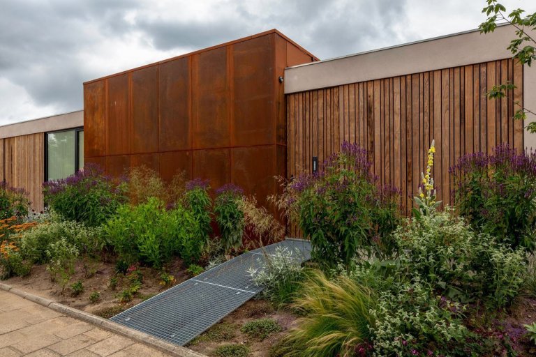 Bungalov zaujímá plochu o velikosti 610 m2. Má tvar písmene L a vcelku nadčasový vzhled. Část fasády bungalovu je obložena rezavějící cortenovou ocelí, zatímco zbytek domu je klasicky omítnut. Tomuto osobitému bydlení nechybí ani velké prosklené plochy, díky nimž proniká do interiéru dostatek přirozeného světla. Místy se tak navíc stírá bariéra mezi interiérem a exteriérem, přičemž o to více vynikají kouzelné průhledy do zahrady a na dřevěnou lávku.