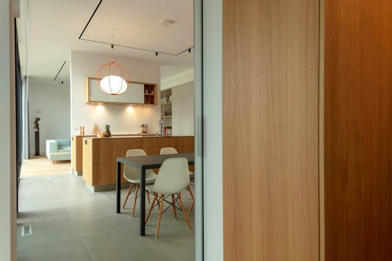 Stejně jako v exteriéru, převládají i uvnitř domu přírodní materiály a barvy. Možnost vyniknout zde navíc dostal minimalistický styl. Dominantním materiálem v interiéru je dřevo, které opticky propojuje jednotlivé prostory a části domu. Bungalov přitom představuje zejména jednoduchý současný design s čistými liniemi. Ten příjemně oživují například zajímavé modré akcenty, které o sobě dávají vědět především v koupelně. Tyto prvky umocňují osobitost interiéru a spoludotvářejí útulnou atmosféru bydlení.