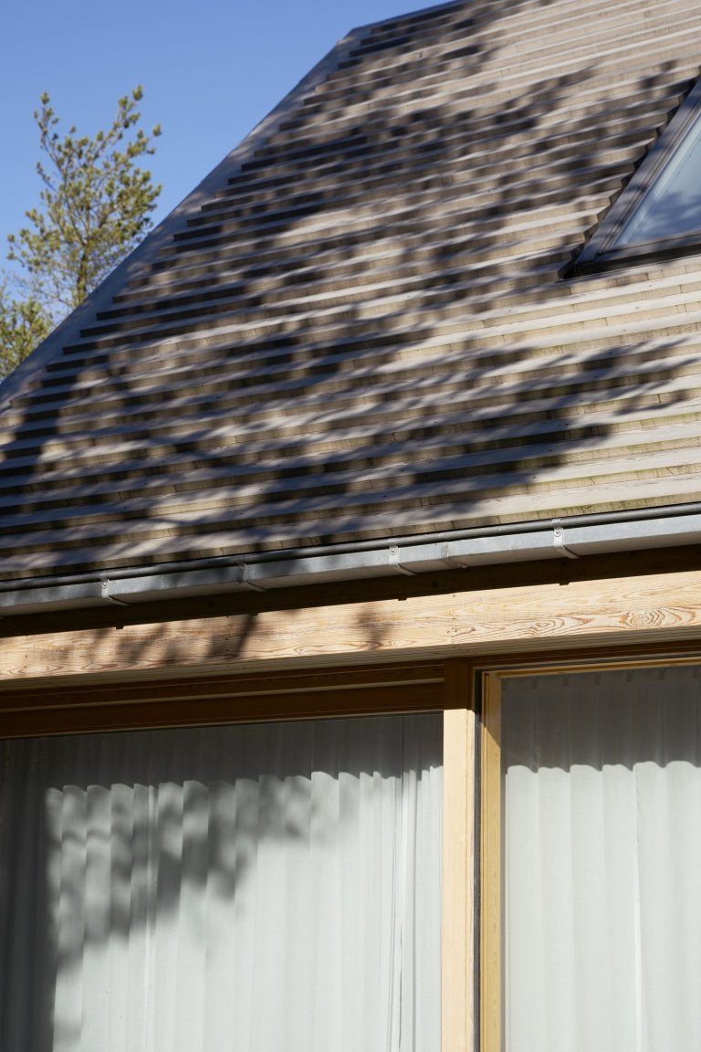 Cílem architekta Johana Sundberga bylo propojit víkendový dům co nejvíce s okolní přírodou. Mezi vzrostlými borovicemi tak vyrostla dvoupatrová dřevostavba, která je zvenku i zevnitř obložena světlým dřevem sibiřského modřínu. Vertikální modřínové desky jsou přitom natřeny ochranným silikonovým tmelem.