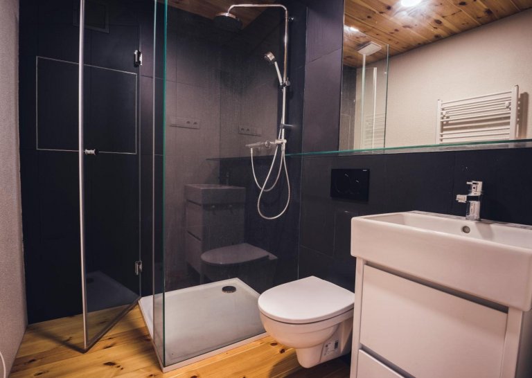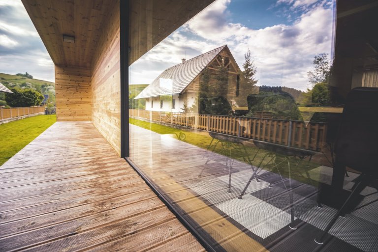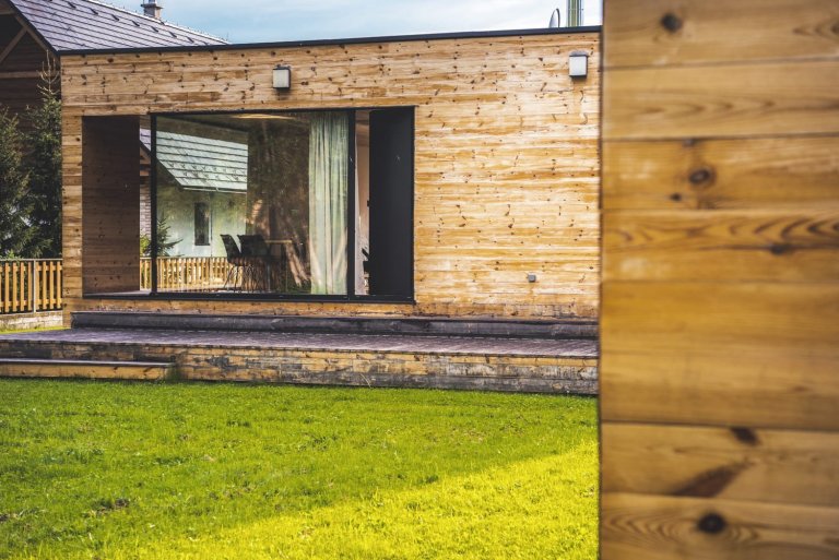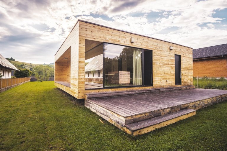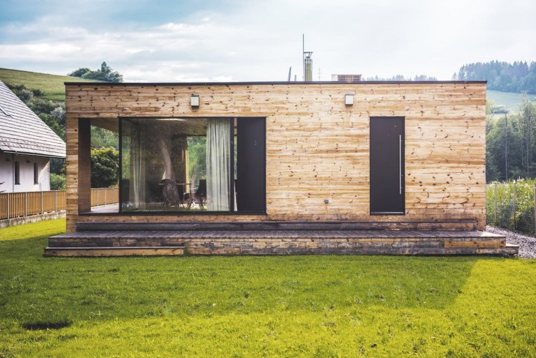 Montovaný ocelový nosný rám s modulem 3750 x 3750 mm, založený na betonových patkách, Martin Bobák kombinuje s dřevěnou trámovou konstrukcí střechy a sloupkovou konstrukcí stěn. Pohledovou vrstvu ze strany exteriéru tvoří horizontální dřevěný obklad fasády. Doplňují ho rozměrné skleněné výplně, osazené do černých hliníkových rámů. Sendvičová obvodová konstrukce je zateplená minerální vlnou.