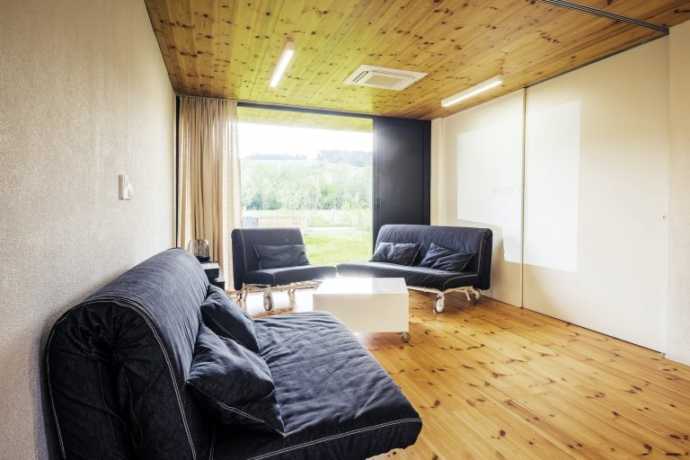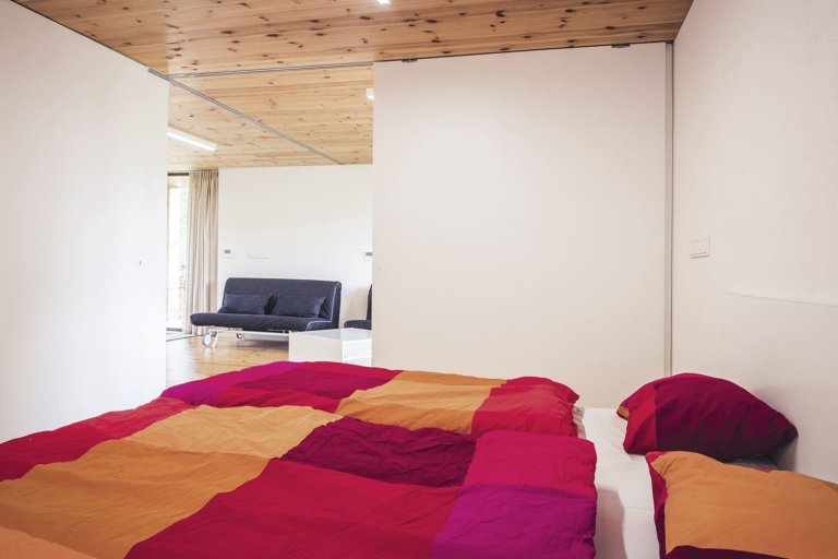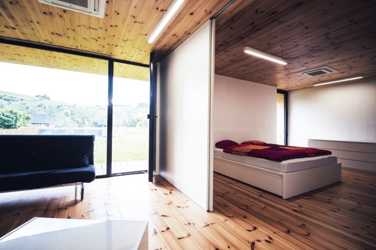 Z převládajícího otevřeného prostoru je tak možné podle potřeby oddělit ložnici, obývák, nebo jídelnu. I z obývací části se tak po uzavření může stát prostor na spaní s vlastním soukromím. Materiály použité v exteriéru plynule přecházejí do vnitřních prostor domu. Na venkovní dřevěný obklad v interiéru navazují povrchy podlah a stropů. Černá barva okenních rámů se objevuje na několika nábytkových prvcích a obkladech v koupelně. Neutrální pozadí pro zařízení interiéru tvoří bílé vnitřní omítky.