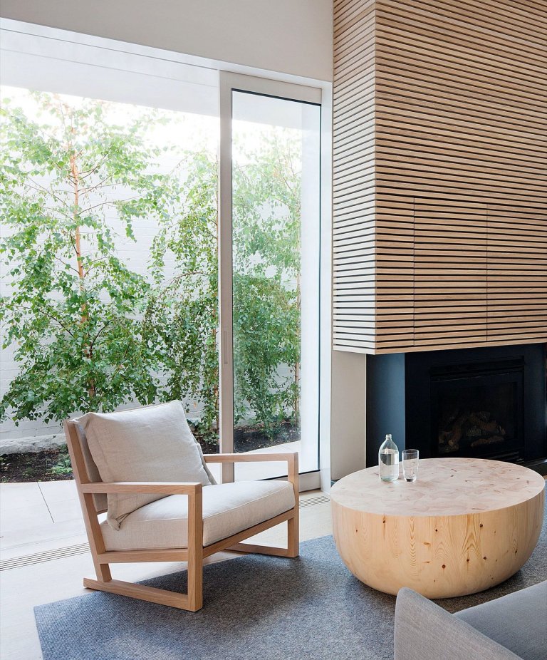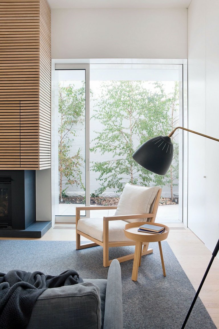 V nově přistavěném patře našly místo dva dětské pokoje a koupelna. V přízemí se nachází obývací pokoj, kuchyně, jídelna, studovna, herna, koupelna a prádelna. S kuchyní je přímo propojená venkovní jídelna. V případě pěkného počasí je tak možné nechat posuvné dveře otevřené a zvětšit prostor interiéru. To samé platí pro obývací pokoj, který je rovněž opatřen praktickými posuvnými dveřmi, jimiž se dá projít na nádvoří plné zeleně. Ve výsledku je tak prostor interiéru zajímavým způsobem rozšířený a příjemně propojený s přírodou. Navíc je nově i dostatečně prosvětlený.