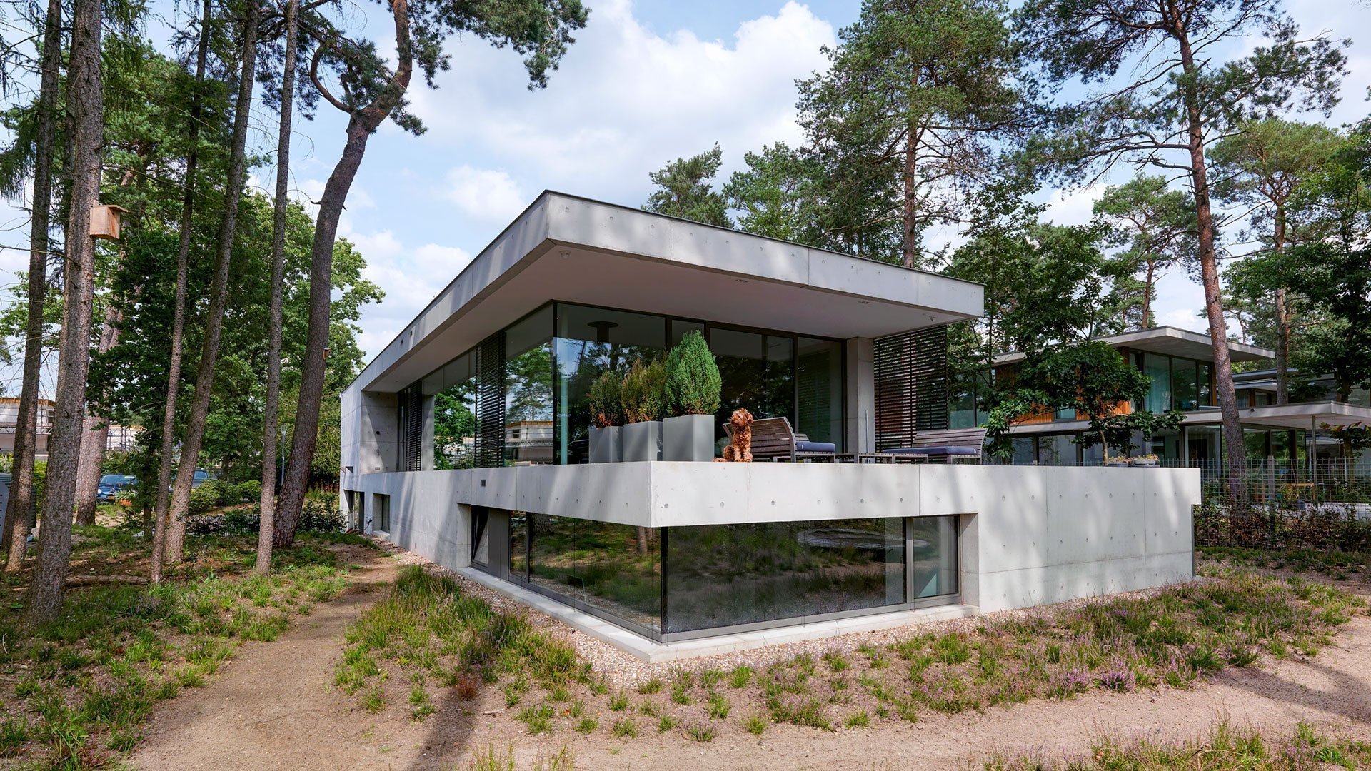 Vila je uvnitř i venku plná betonu, což není zrovna běžná konstrukční metoda v Nizozemsku. Z ulice vede cestou podél uzavřené fasády k předním dveřím betonový běžec. V zadní části domu se rozléhá krajina s velkým panoramatickým výhledem. Vybudováním ložnic, koupelen a kanceláře je dům vyhovující potřebám všech členů rodiny. I vnímání okolní přírody je z každé místnosti tohoto domu odlišné. Z ložnice a koupelny je výhledová výška stejná jako úroveň přízemí (to znamená, že jsou okna ve stejné výšce jako půda venku). Naopak – z obývacího pokoje je výhled na okolní lesy a vřesoviště. Neupravený beton dodává domu čistý vzhled, který kontrastuje s elegancí okenních rámů, žaluzií a interiéru.
